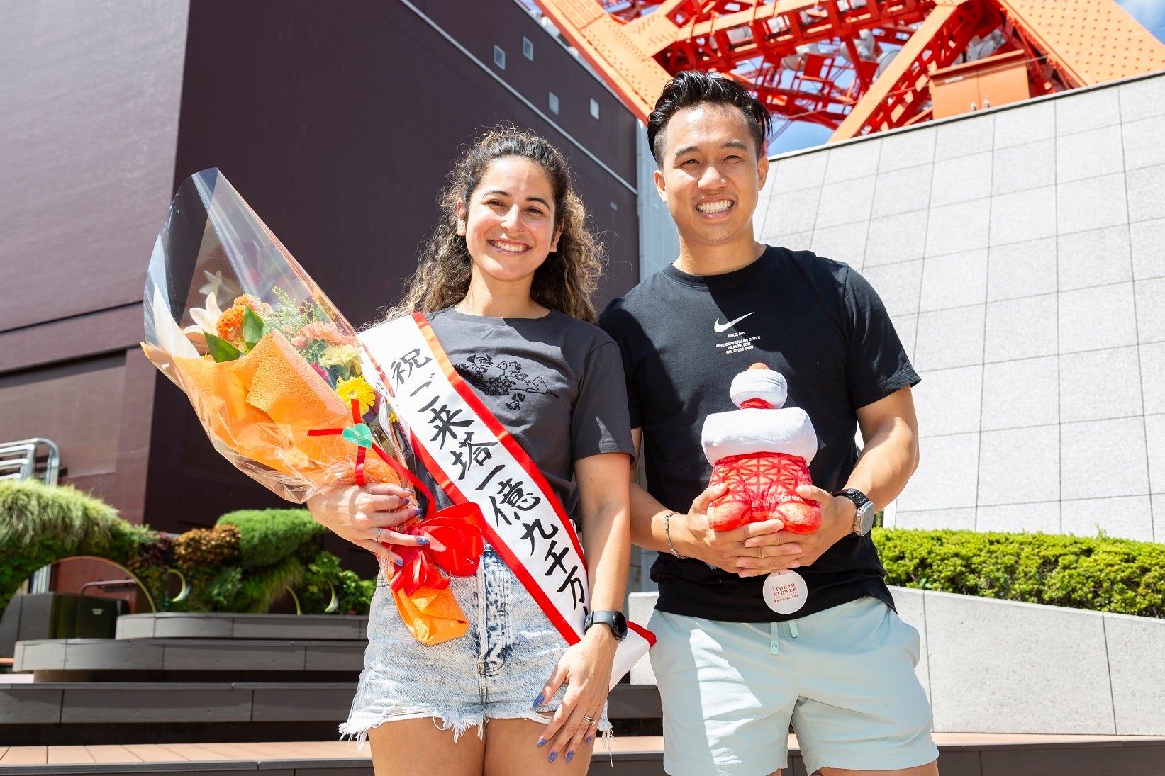 ご主人のトビー様は、「東京タワーに来たのは初めて。5年前に結婚したが、コロナ禍で日本に来ることができなかった。今回はハネムーンで来た。東京タワーには、東京の街並みが見たくて来たが、景色が思っていたより綺麗でビックリした。(1億9,000万人達成予定を)何も知らずに来たので驚きました」と、感想を述べられました。