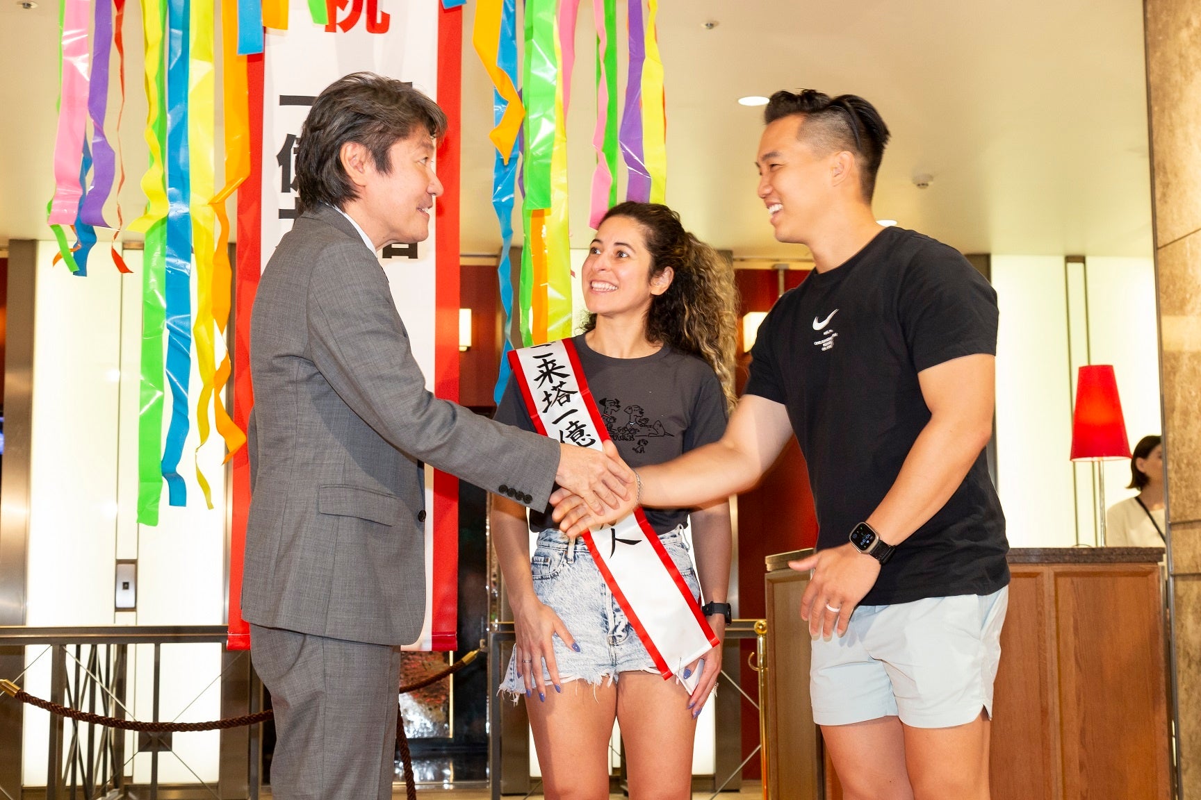 ※奥様のラウレン・トング様が「祝 ご来塔1億九千万人」のタスキをかけて入場