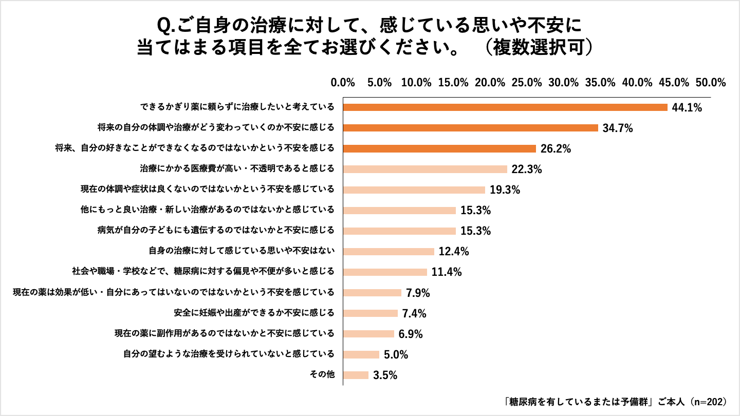 回答者のうち、「できる限り薬に頼らず治療したい」という方が44.1%、「将来の自分の体調や治療がどう変わっていくのか不安」という方が34.7%、「将来、自分の好きなことができなくなるのではないかと不安」という方が26.2%と、糖尿病の治療について様々な思い・不安があることが明らかになりました。
