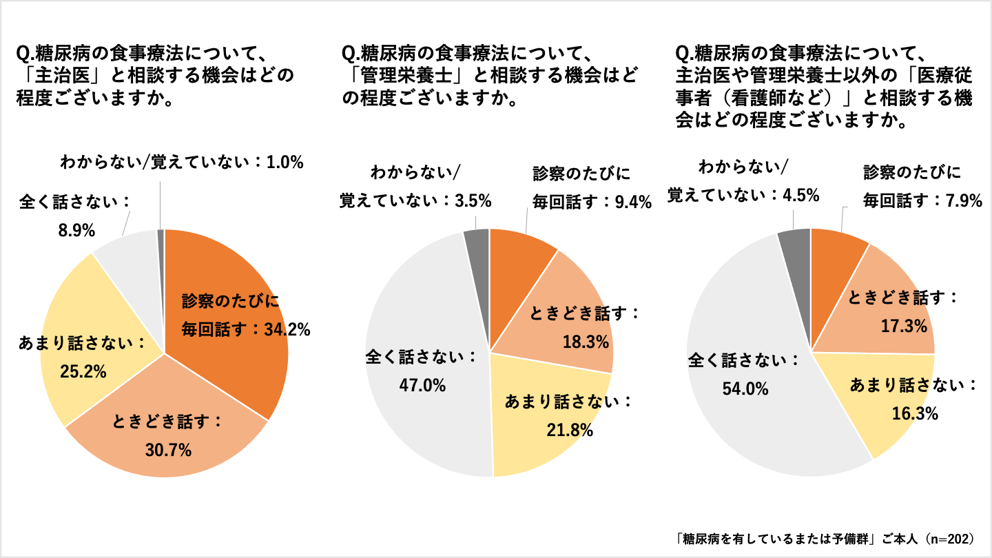 食事療法について相談する機会が最も多いのは「主治医」であり、64.9%の方が食事療法について「診察のたびに毎回話す」「ときどき話す」と回答されました。一方で、管理栄養士や看護師など他の医療従事者との相談機会を持つ方は多くないことが伺えます。