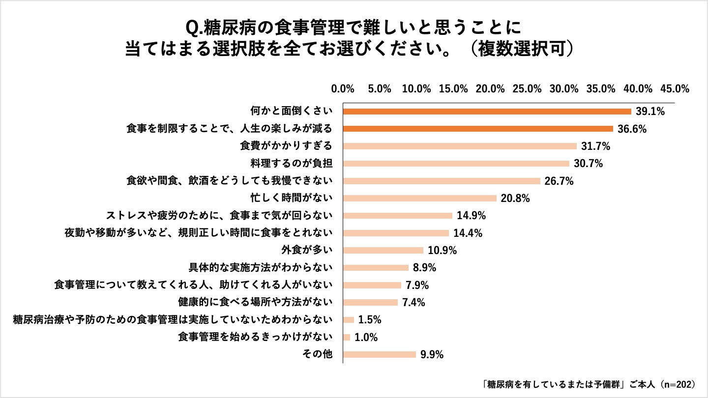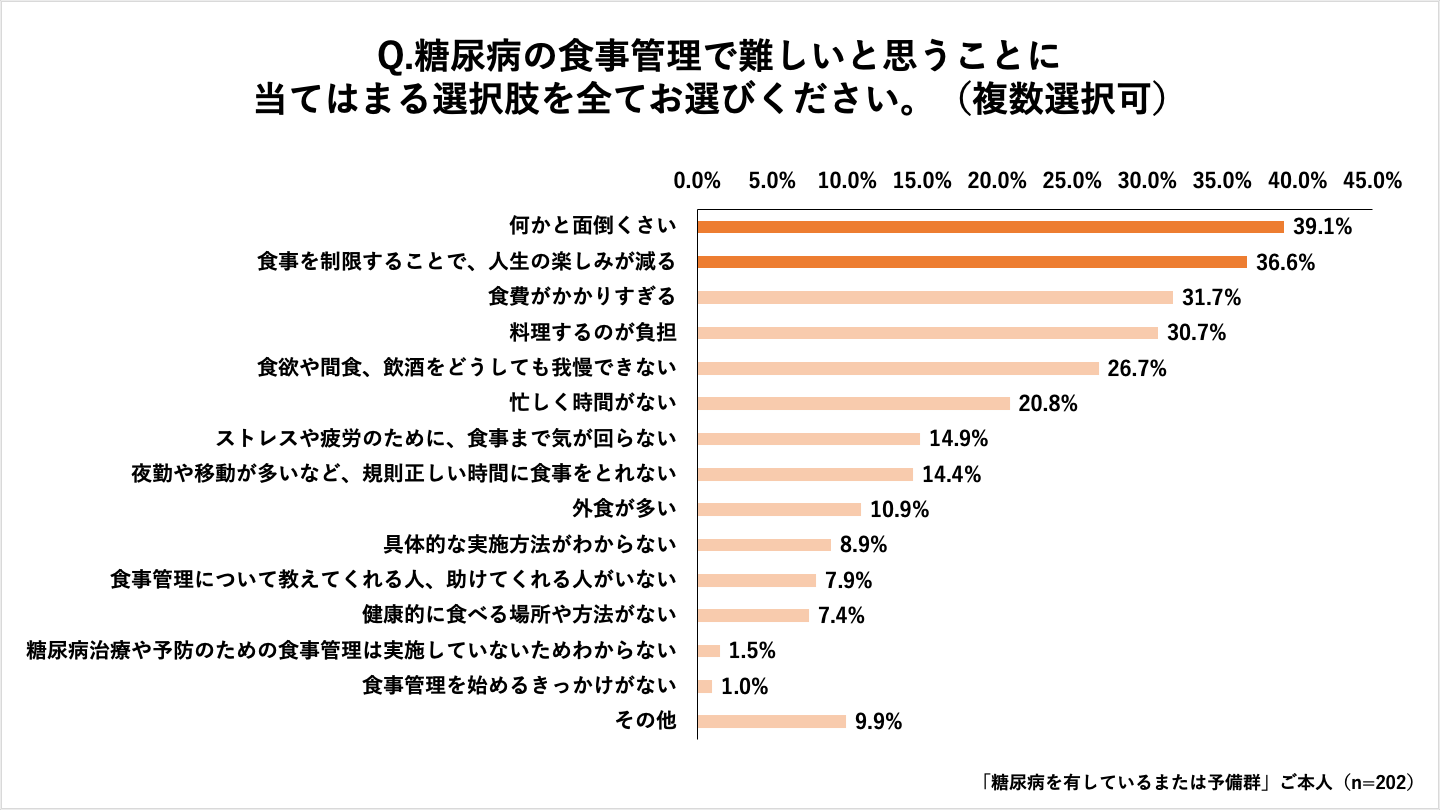 糖尿病の食事管理における難しさについて、「何かと面倒くさい」「人生の楽しみが減る」といった”QOL(=生活の質)の低下”を要因として挙げる方が多い回答結果となりました。