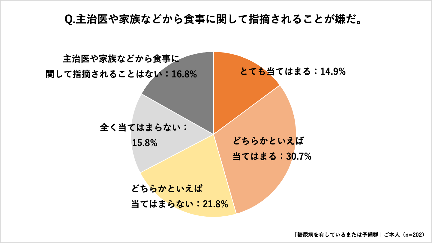 回答者の45.5%が、「主治医や家族などから食事に関して指摘されることが嫌だ」と感じています。主治医や家族は、患者を心配しているからこその指摘であると考えられますが、時として糖尿病のある人の肯定感を損なっている可能性に配慮が必要のように考えます。