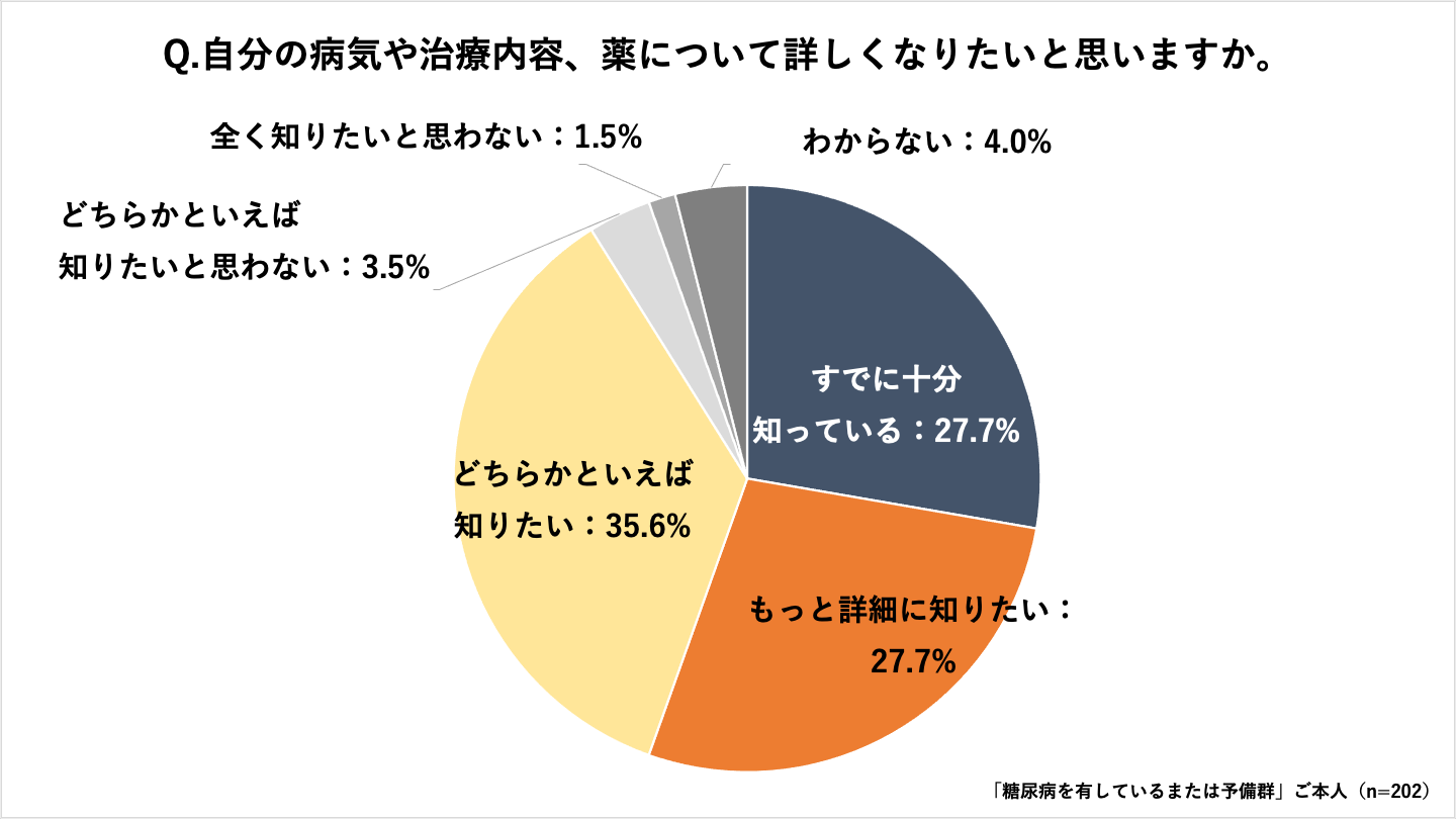 回答者の63.4%が「自分の病気や治療内容、薬について詳しくなりたい」と思われておりました。当社は、糖尿病の治療において、主治医をはじめとした専門家の方々に対してより一層気軽に相談できる機会や、自分の知りたいことを調べることができる情報源等を創出することが重要であると考えています。