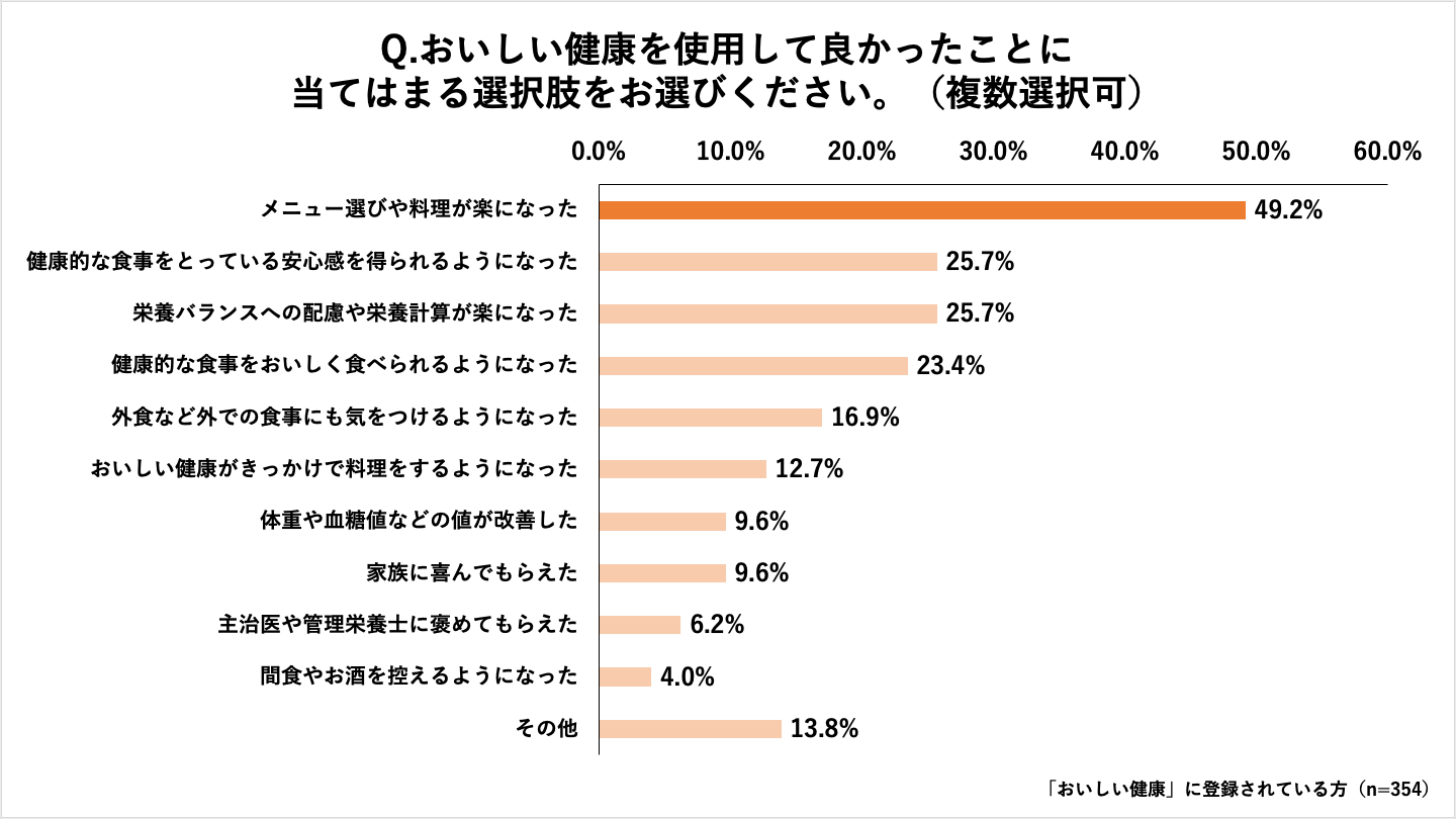 おいしい健康アプリでは、できる限り好きな食事・いつもの食事で、糖尿病のある人・ご家族の食生活をサポートしております。今回の調査では、「おいしい健康を使用して良かったこと」についてお聞きした結果、「メニュー選びや料理が楽になった(49.2%)」ことが特に高く評価されました。