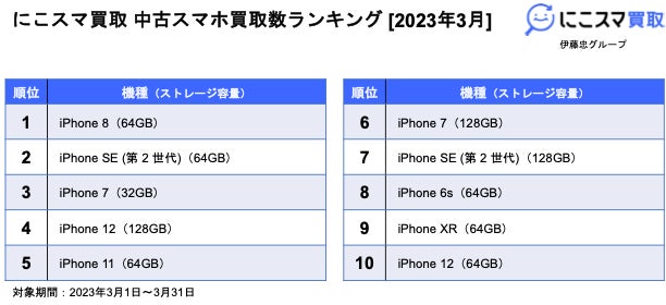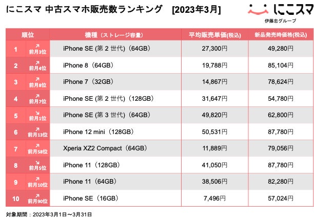 - にこスマ 中古スマホ販売数ランキング [2023年3月]