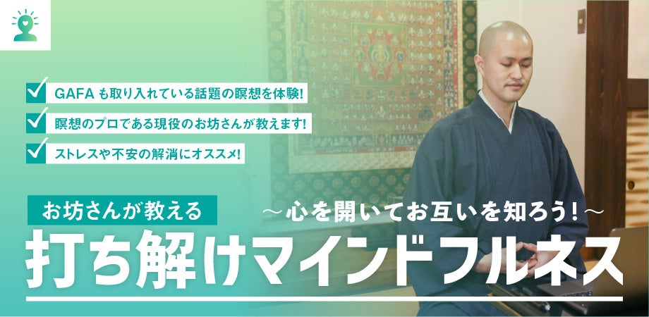マインドフルネスとは、米国大手IT企業等をはじめ様々な企業が取り入れていることで話題となっている瞑想を体験できるプログラム。