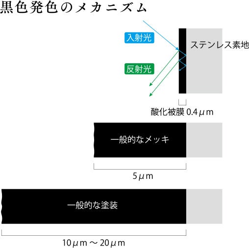 メッキや塗装とは異なり、素材の表面に極薄の黒色酸化被膜を成長させ、光の