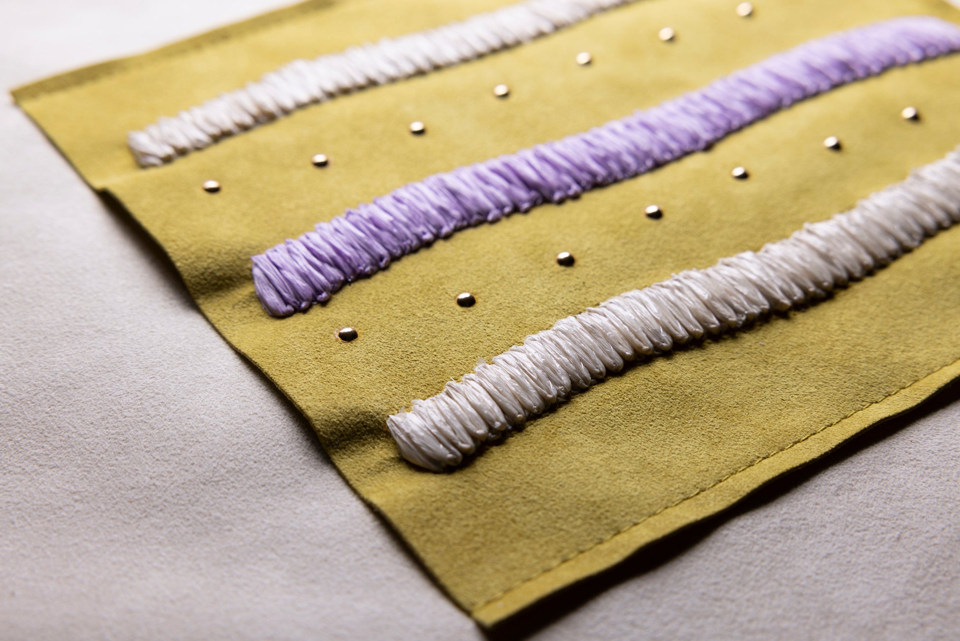 また、パンチング加工やエンボス加工、透かしデザインなど、細部までこだわった技術を駆使。アルカンターラとチュールを組み合わせた軽やかなテクスチャーが、エレガントな表情を演出します。さらに、虹色に輝くラミネート加工を施すことで、春のアウターやアクセサリーに華やかさをプラス。刺繍やラフィア、スタッズをあしらった幾何学的なポケットは光を反射し、コレクション全体の洗練された雰囲気を引き立てます。