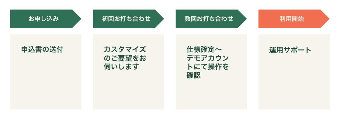 カスタマイズのご要望がある場合、仕様確定からデモアカウント提供までに最低1ヶ月程度いただいております。