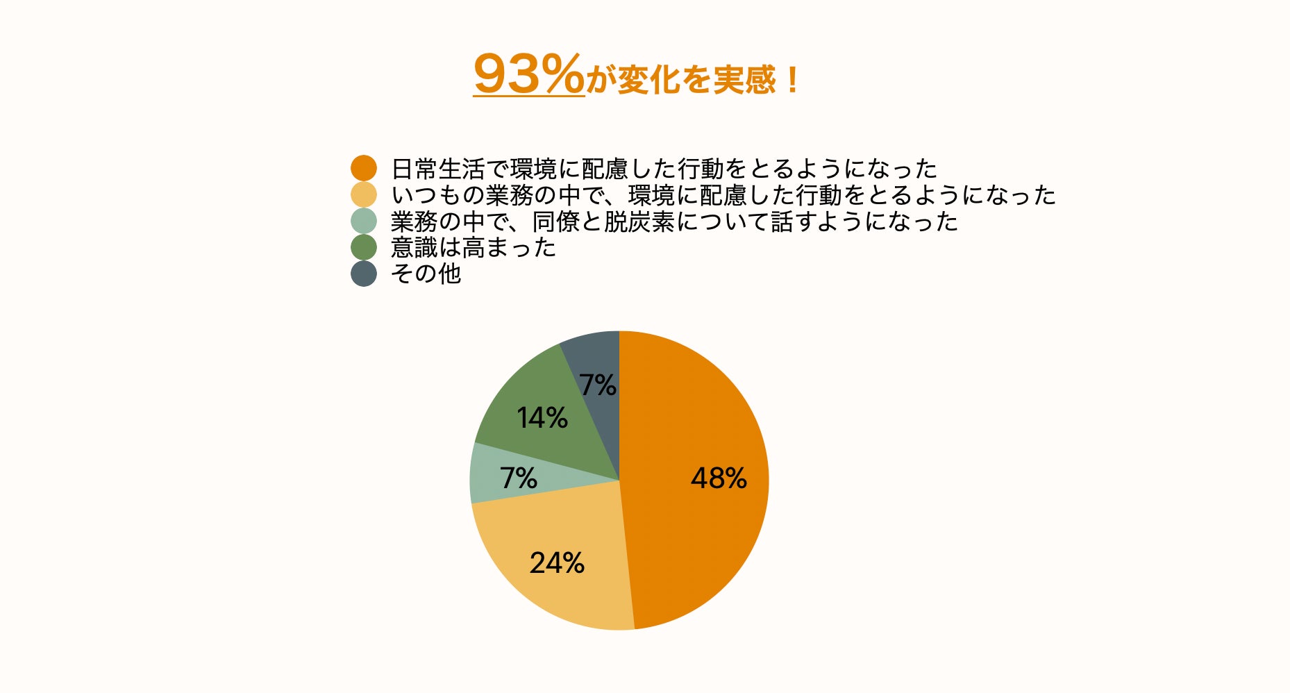 脱炭素に向けた取り組みは、重要性を理解しつつも、成果が見えづらいことからなかなか続かないという課題があります。「エコいっぽ」は、ポイントのインセンティブとゲーミフィケーションを取り入れることで、非常に高いアクティブ率(89%)を維持しました。また、取り組み後に93%が意識浸透・行動変容を実感しました。「エコいっぽ」は、まずはこの「意識浸透率」で成果をはかることから貴社の脱炭素への最初の一歩をサポートいたします。
