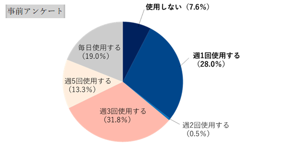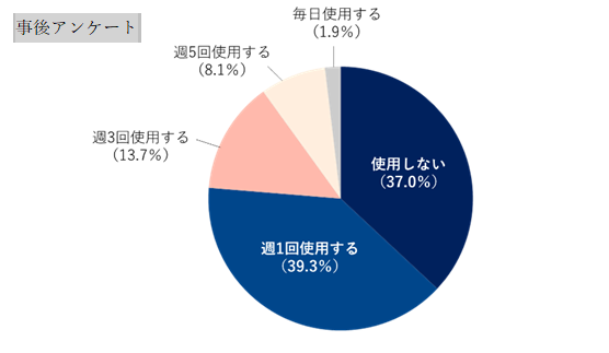 ◆事前アンケートでは「使い捨て容器をどのくらいの頻度で使用するか?」という質問に対し、「使用しないまたは週に1回のみ」と答えた割合は75名(35.6%)にとどまりました。しかし、タンブラー配布とサーバー設置後の事後アンケートでは、同じ質問に対して「使用しないまたは週に1回のみ」と答えた割合は、161名(76.3%)に上昇しました。