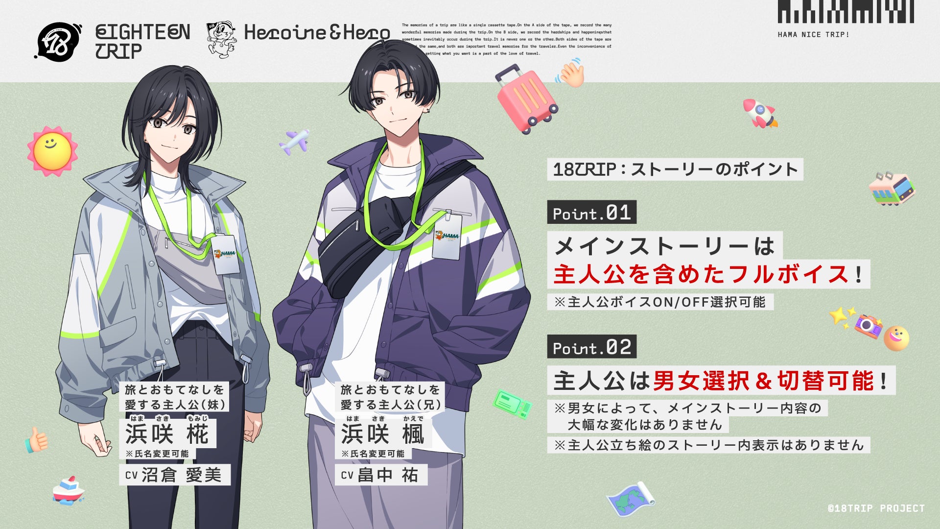 『18TRIP』は近未来の横浜「HAMA18区」を舞台に、旅をテーマに展開される“おもてなしアドベンチャー”です。かつて国内有数の観光地だったにもかかわらず、厳しい状態に追い込まれている「HAMA18区」。そんなHAMAで生まれ育った主人公は、幼なじみの大黒 可不可に巻き込まれるまま観光業立て直しのため、旅行会社「HAMAツアーズ」で奮闘することになります。