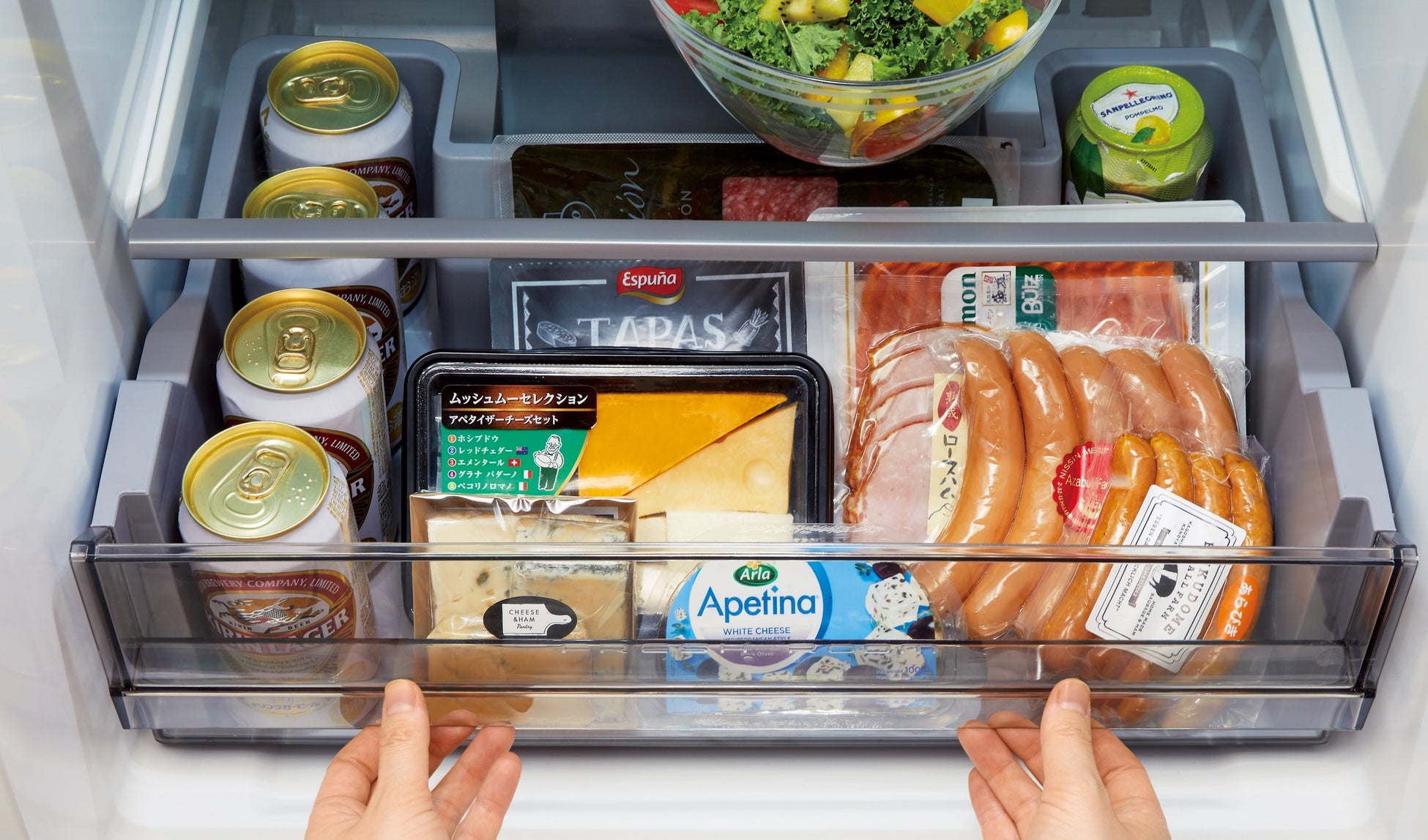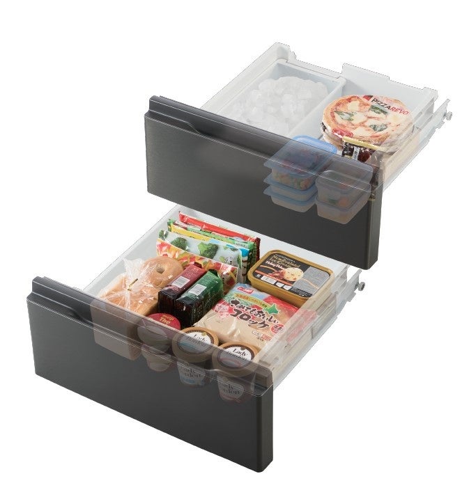 定格内容積301~400Lクラスの冷凍冷蔵庫で冷凍室100L・2ドアを採用しているのはAQUAだけ(※2)。また、まんなかに位置し多段構造のため、まとめ買いをしても整理がしやすく、食材の出し入れがスムーズです。