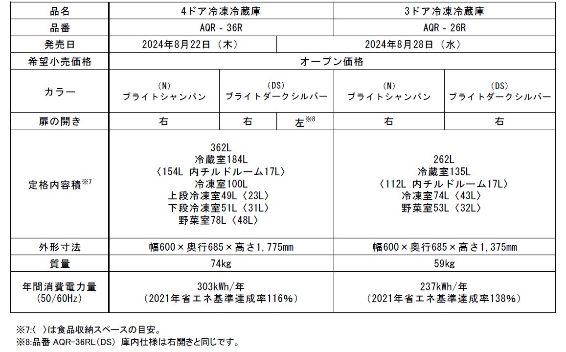アクア株式会社(本社:東京都中央区、代表取締役社長 兼 CEO:杜 鏡国)は、冷凍冷蔵庫の新モデル「FREEZIA+(フリージア・プラス)」シリーズ(品番:AQR‐36R、AQR‐26R) を2024年8月22日(木)より順次発売いたします。