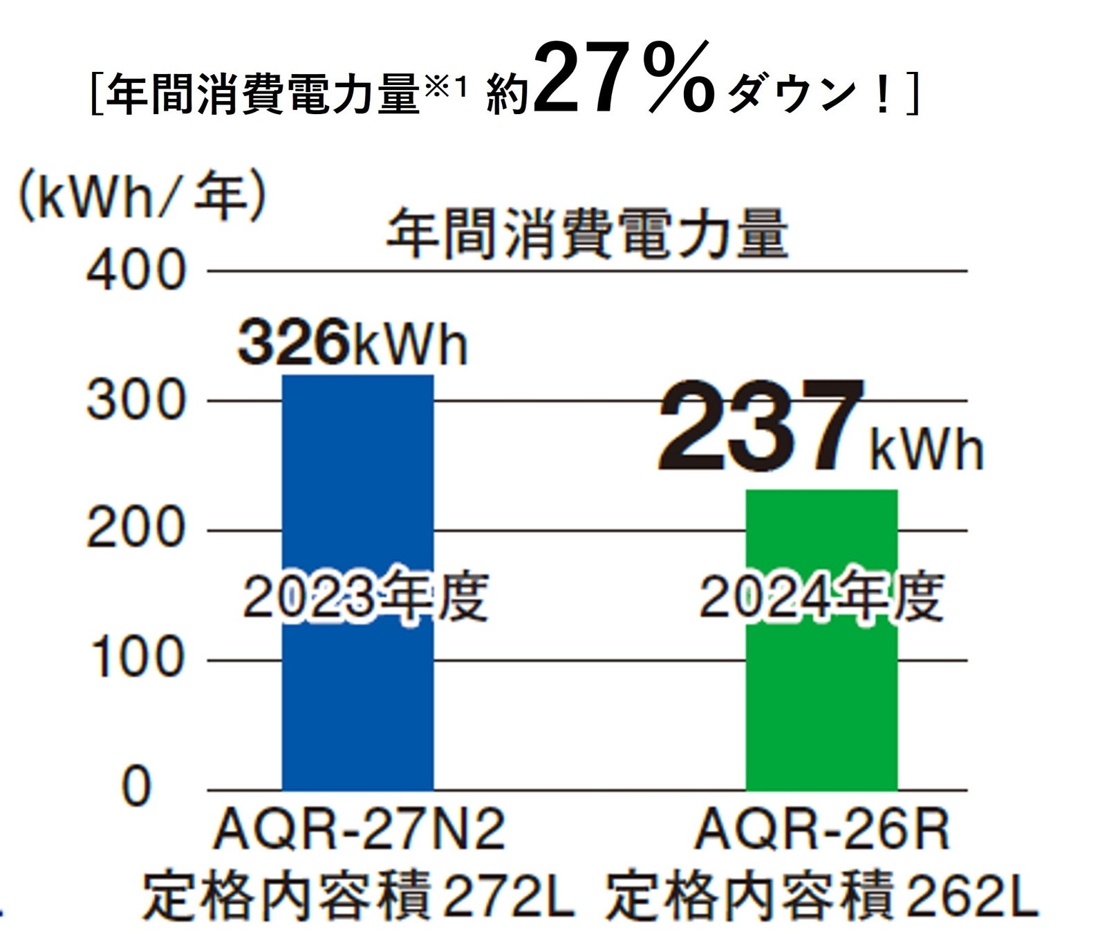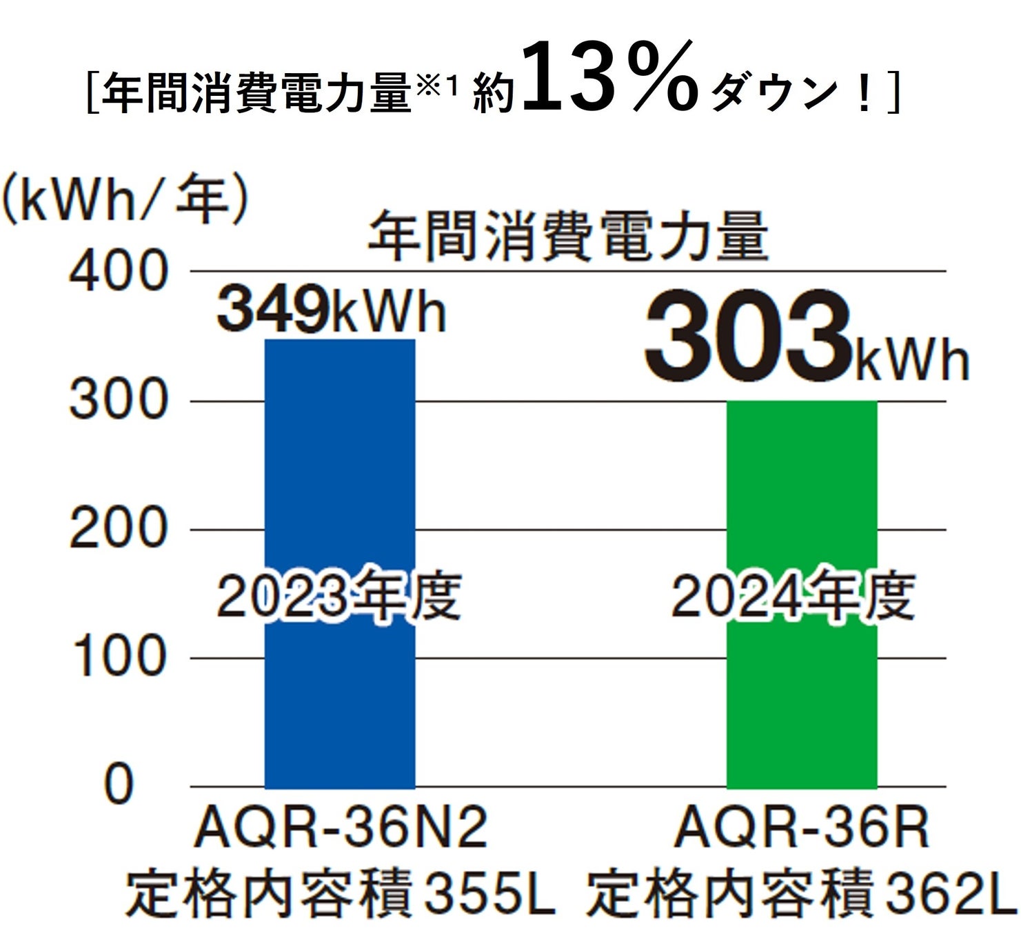 ※1: 当社2023 年モデルAQR-36N2 /AQR-27N2の比較として。年間消費電力量はJIS C 9801-3 :2015測定基準による数値。実際に各家庭で使用された場合には、設置条件・扉開閉回数・外気温度等により、消費電力量は異なります。