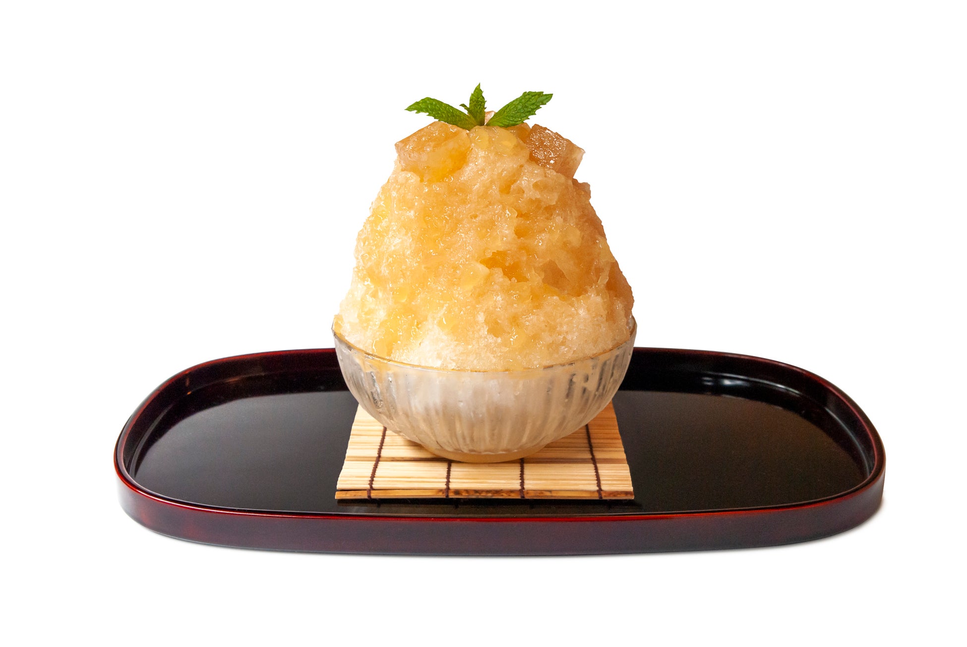 もちもち・つぶつぶ食感の「道明寺(どうみょうじ)」は、もち米由来。関西風の桜餅をはじめ上生菓子、棹物など、古くから和菓子には欠かせない素材です。この原料となる「道明寺粉」をりんごジュースにひたして、みずみずしい甘味が美味しい「りんご風味の道明寺羹」をつくりました。ころころと角切りにした「道明寺羹」は見た目も涼やか、氷のしゃりしゃり食感とのアクセントも魅力のトッピングです。