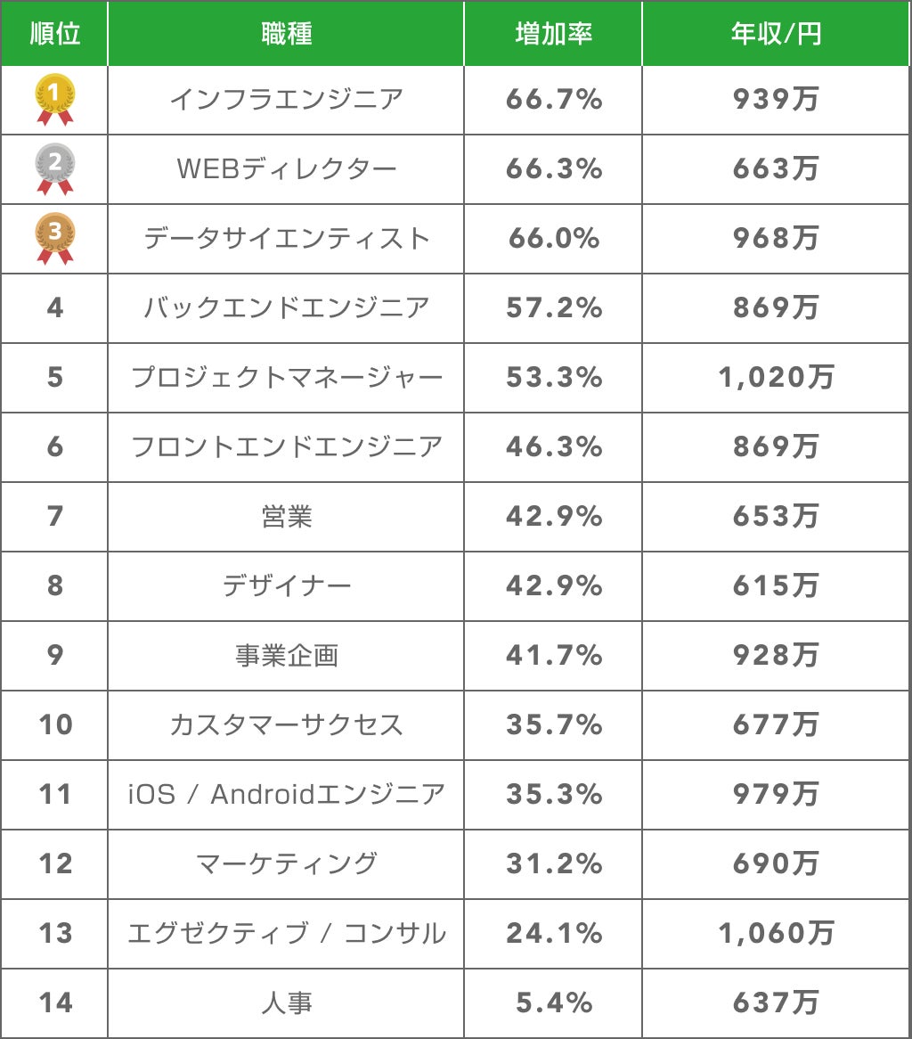 ・1位インフラエンジニアの増加率は67%、平均年収も939万円と高水準