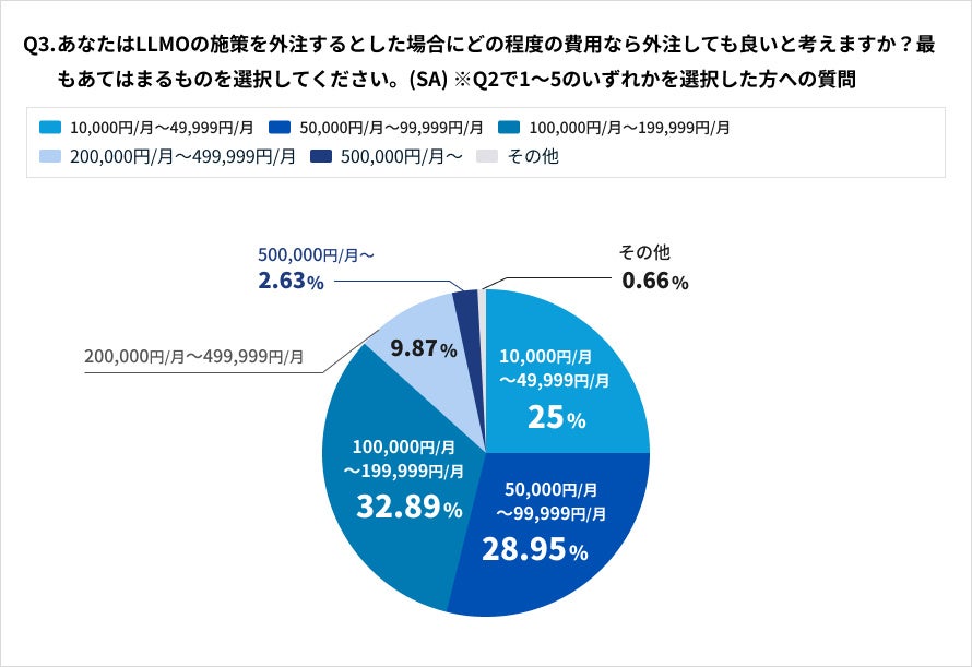 ● 外注費用: LLMO施策を外注する場合、「100,000円/月〜199,999円/月」(32.89%) の費用を許容する回答が最も多くなりました。