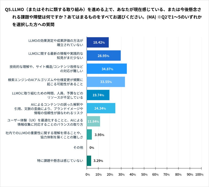 LLMOへの取り組みに関与または関心がある回答者に対し、LLMO(またはそれに類する取り組み)を進める上で感じている、または懸念される課題や障壁を尋ねました。