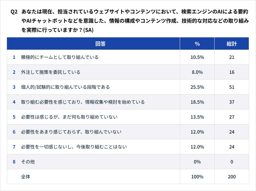 検索エンジンのAIによる要約やAIチャットボットなどを意識した、情報の構成やコンテンツ作成、技術的な対応などの取り組み状況については、以下のようになりました。
