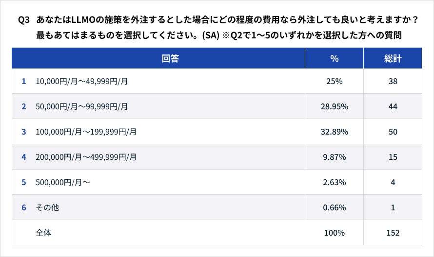 Q3: LLMO施策の外注許容費用 (Q2で1~5のいずれかを選択した方対象、N=152)