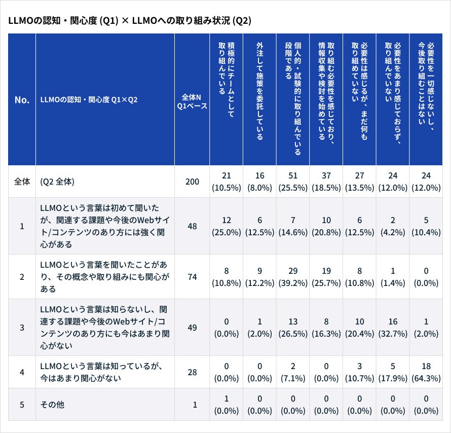 LLMOの認知・関心度 (Q1) × LLMOへの取り組み状況 (Q2)