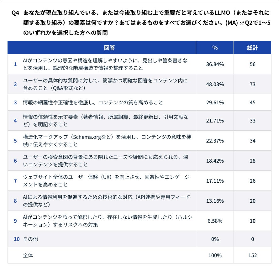 ● 重視するLLMO要素: 「ユーザーの具体的な質問に対して、簡潔かつ明確な回答をコンテンツ内に含めること(Q&A形式など)」(48.03%) が最も重視されており、次いで「AIがコンテンツの意図や構造を理解しやすいように、見出しや箇条書きなどを活用し、論理的な階層構造で情報を整理すること」(36.84%) と続きました。