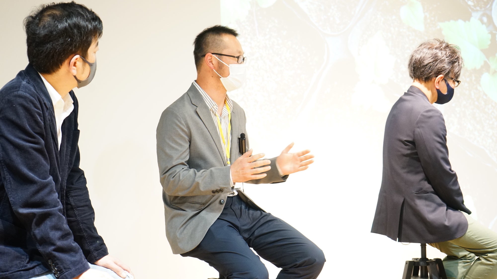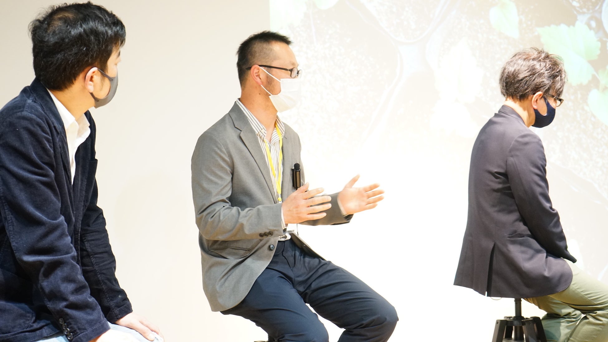 ぶどう農家の林慎悟さん(岡山県岡山市・林ぶどう研究所)、サバの養殖を営む横山拓也さん(福井県小浜市・田烏水産株式会社)に登壇いただき、「一次産業が直面する気候変動」をテーマにトークセッションを実施しました。当社代表高橋がモデレーターを務め、自然環境の変化が生産に及ぼす影響や、必要な取り組みをお聞きしました。