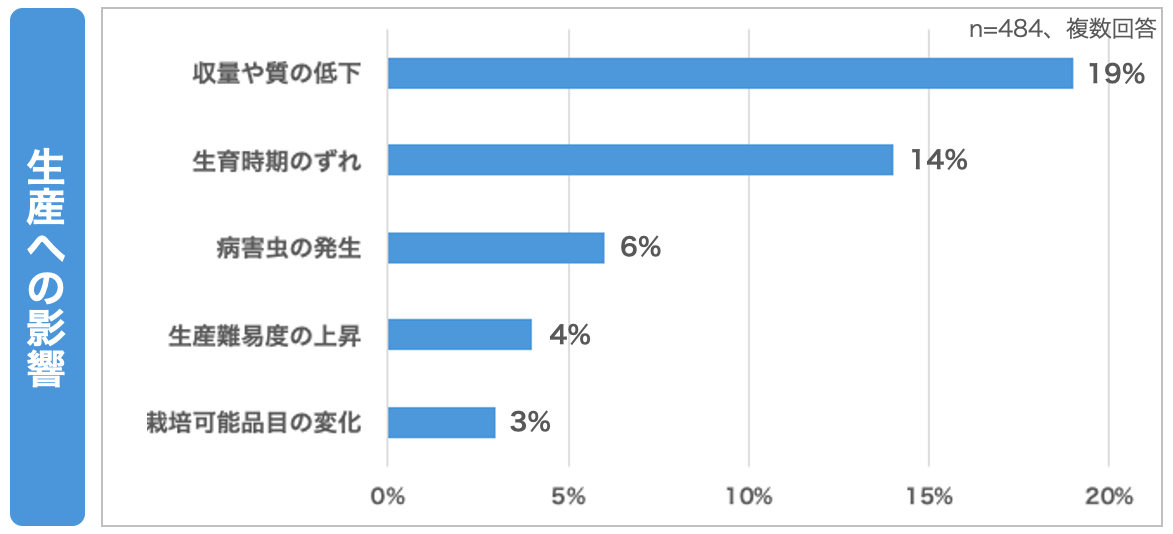 また、生産への影響の事例は、農産物の着色遅延や、家畜の斃死といった「収量や質の低下」が19%と最も多く挙げられました。次いで、播種・開花・受粉・収穫などの「生育時期のずれ」への言及が14%という結果になりました。