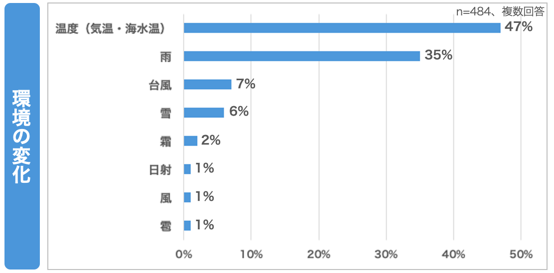 さらに、具体的な事例を尋ねたところ(注)、多く挙げられた環境の変化は、「温度(気温・海水温)」と「雨」に関する事象でした。「温度(気温・海水温)」については、40%が「上昇」への言及だった一方で、「低下」に言及する回答も2%ありました。「雨」については、「豪雨」や「長雨」といった雨量の増加に言及した回答が、29%と多く見られました。