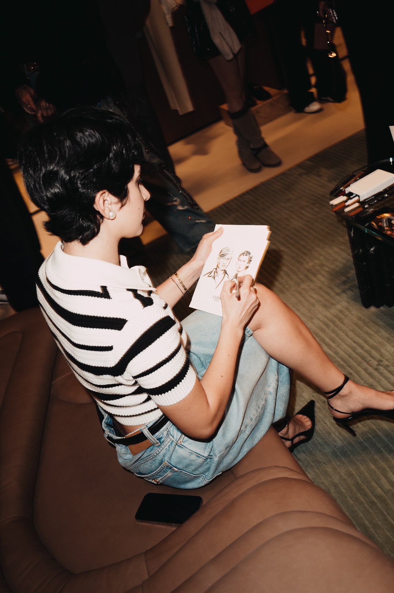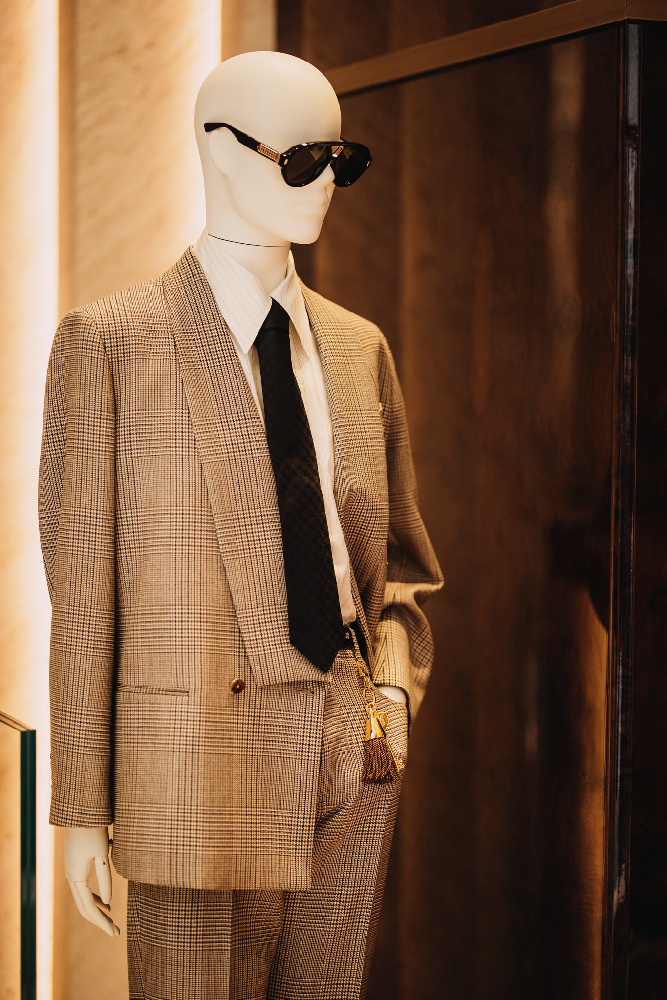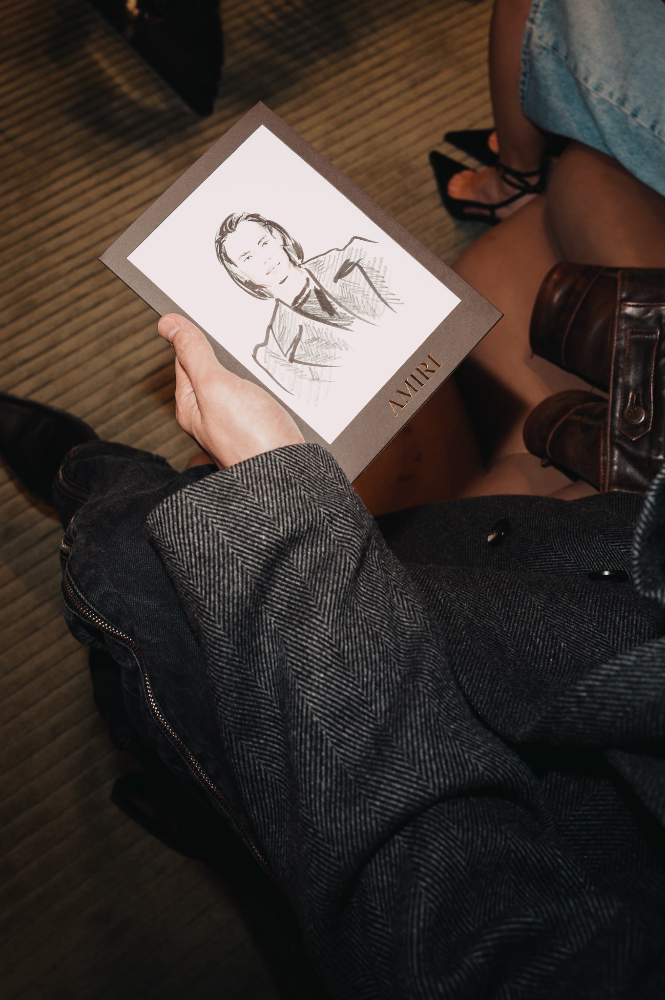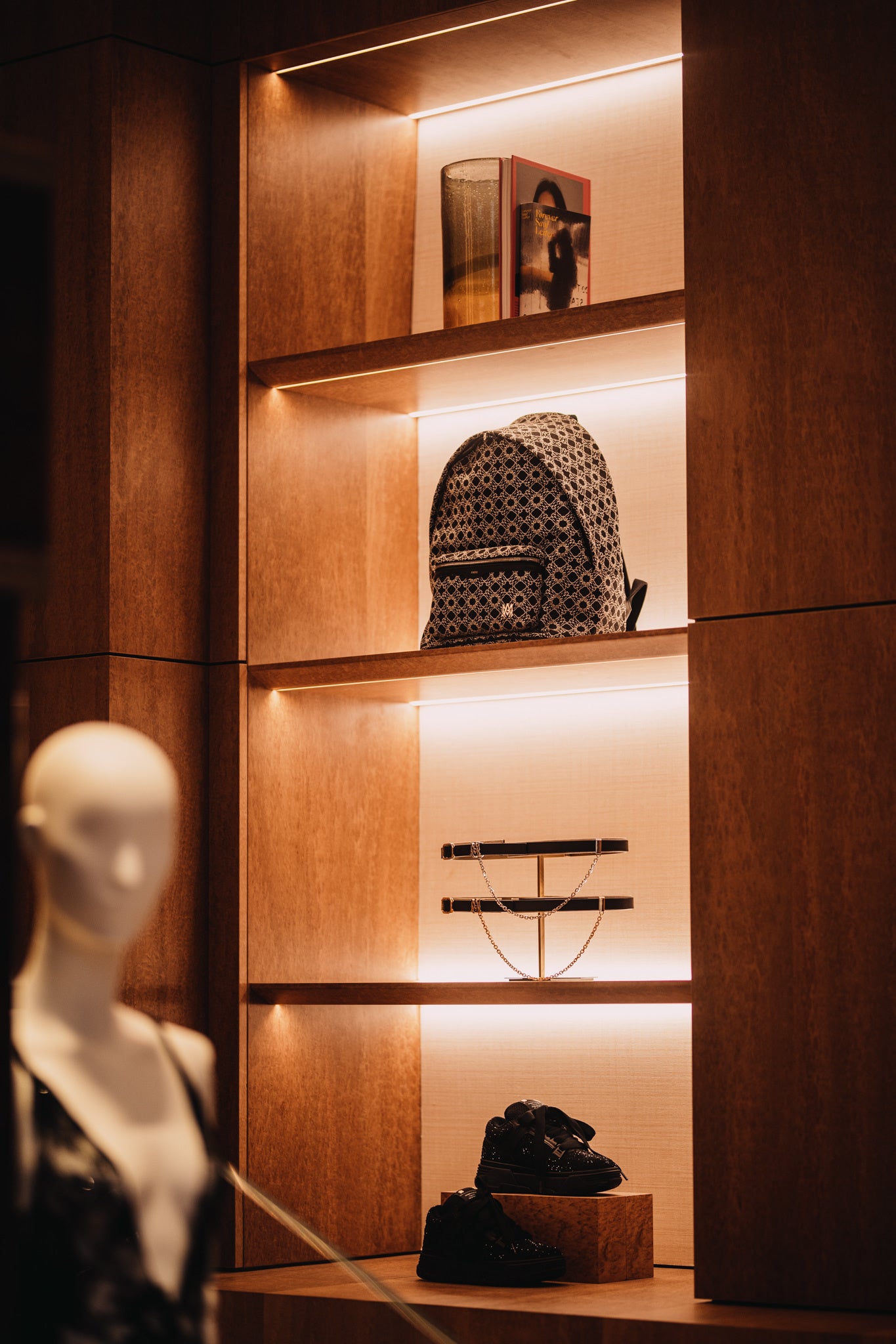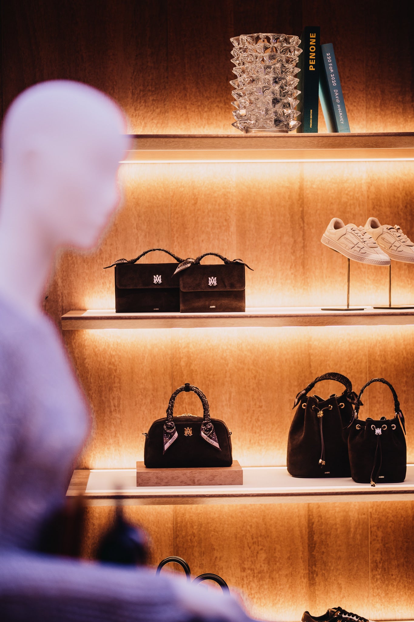現実と幻想の境界線が曖昧に溶け合う店内は、映画の舞台を想起させ、想像上の物語をほのめかすアミリのコレクションに相応しい外郭を形作ります。複数の独立した空間は没入型のセットのように展開され、アミリの世界観の各要素がそれぞれの景色を見出します。訪れた人は、木材、トラバーチン、ライムストーンといった天然素材の質感と、格子模様のクォーツの床が織りなす空間へと迎え入れられます。その洗練されたラインは1920年代の象徴的な建設を想起させ、ハリウッドとミラノ双方の美学を呼応させています。
