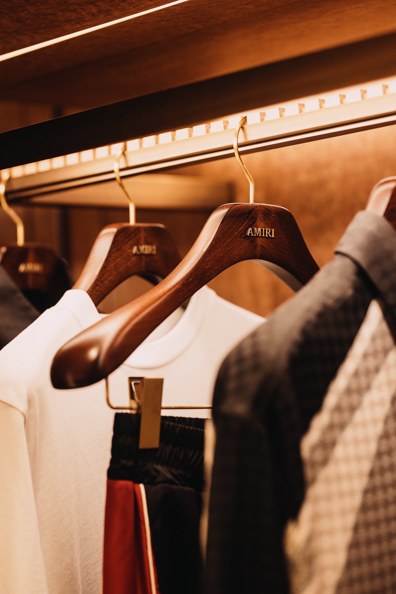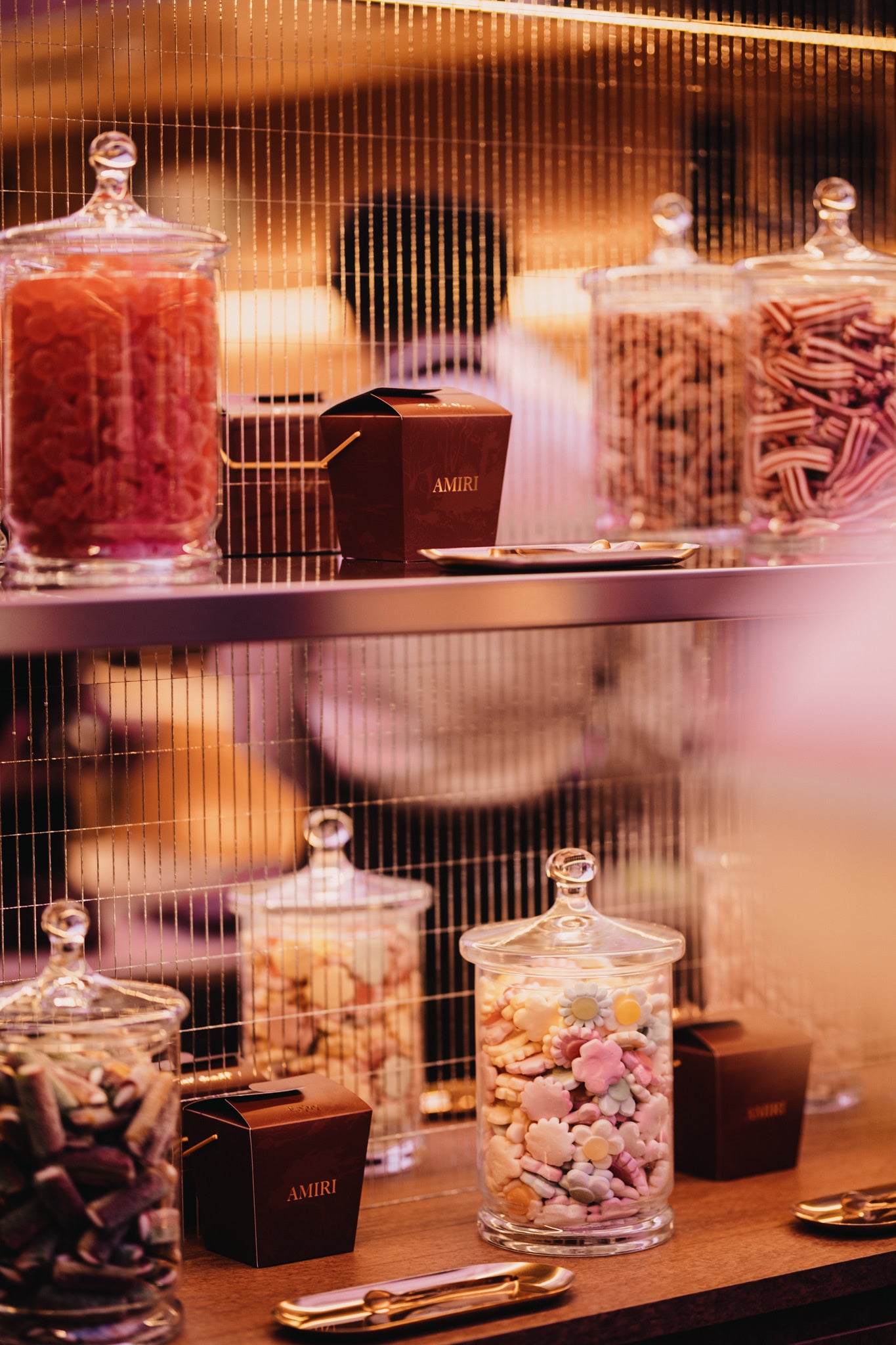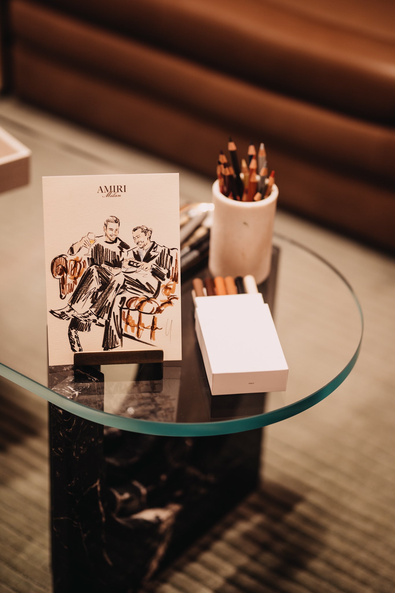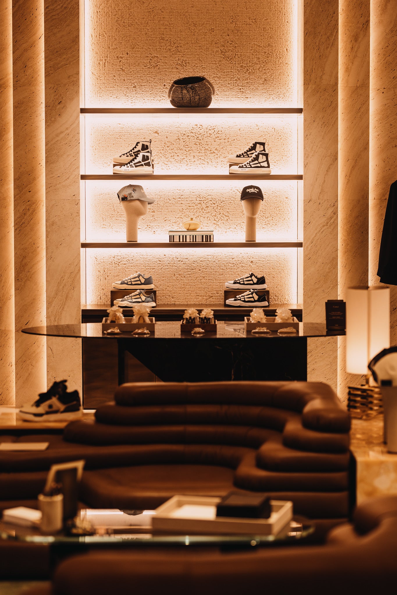 空間設計およびインテリアの構想は、ブランドの核となるハリウッド黄金期に深く根差しています。クラシックホテルのラグジュアリーな空間や、壮大なハリウッドヒルズに佇む由緒ある邸宅を想起させる設えが、アミリの世界観を体現しています。