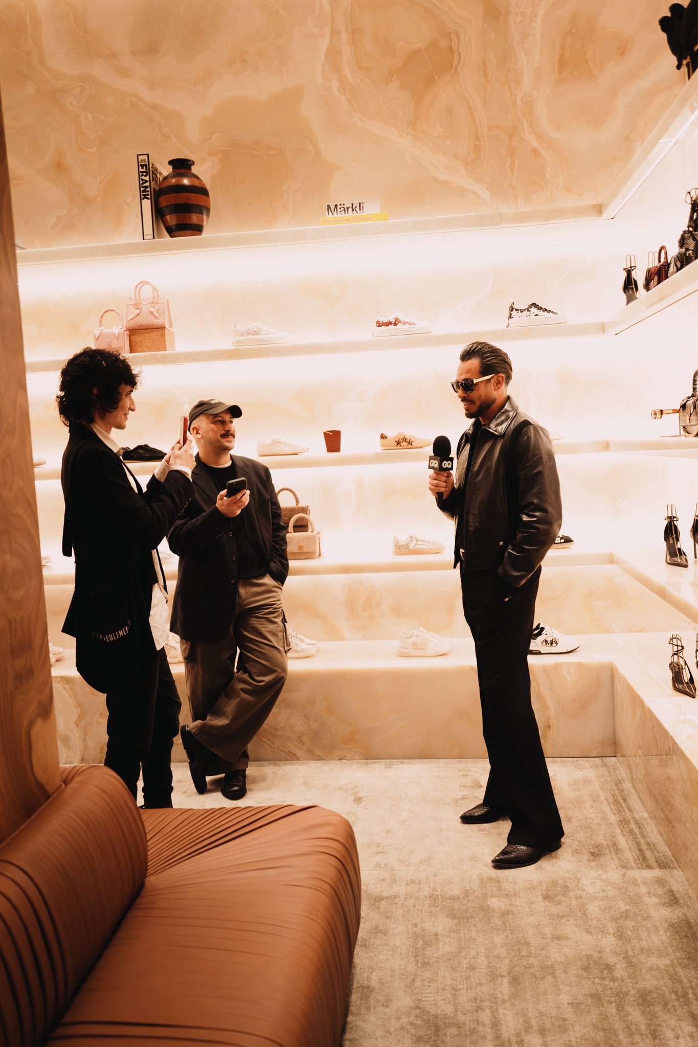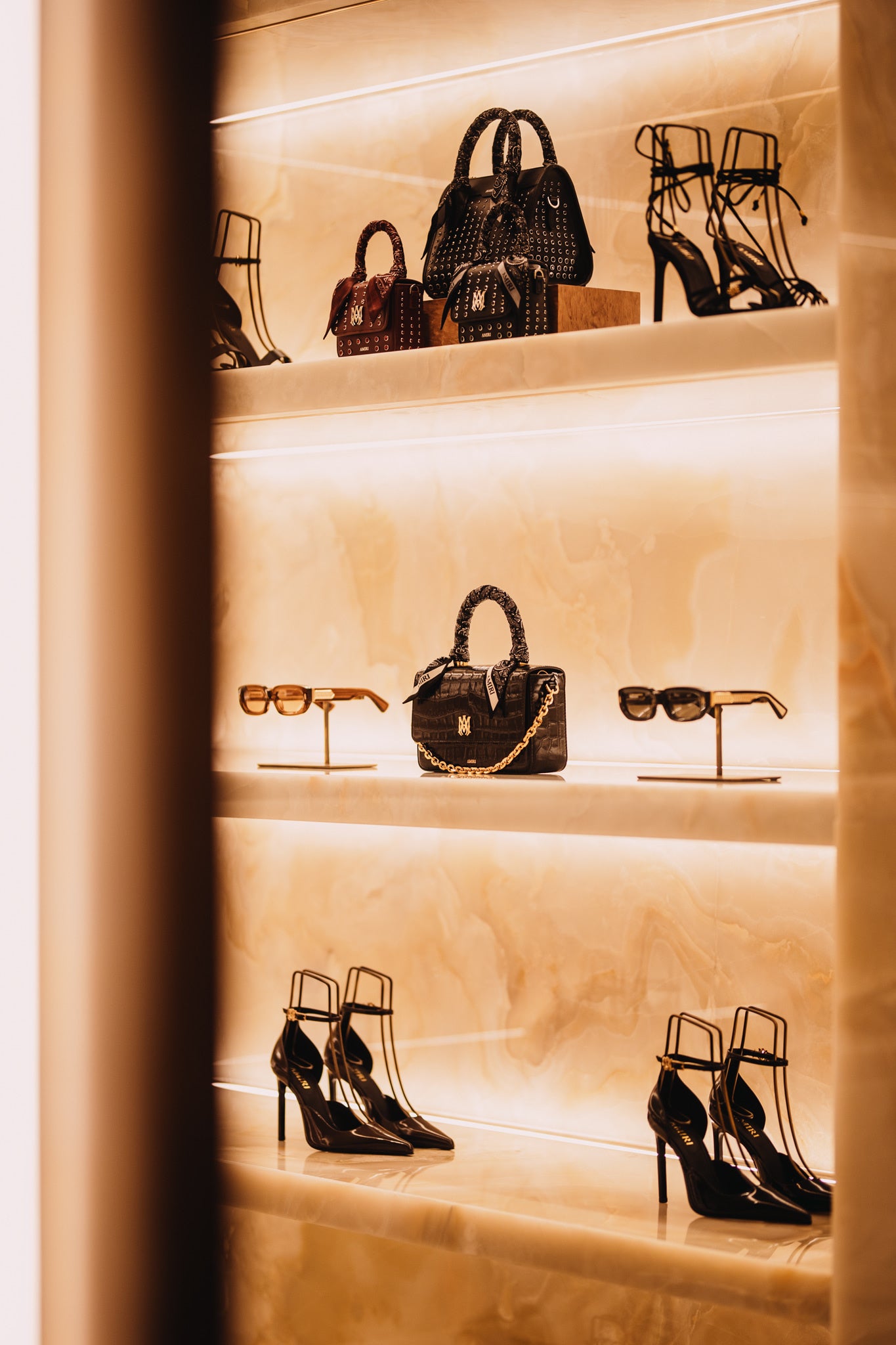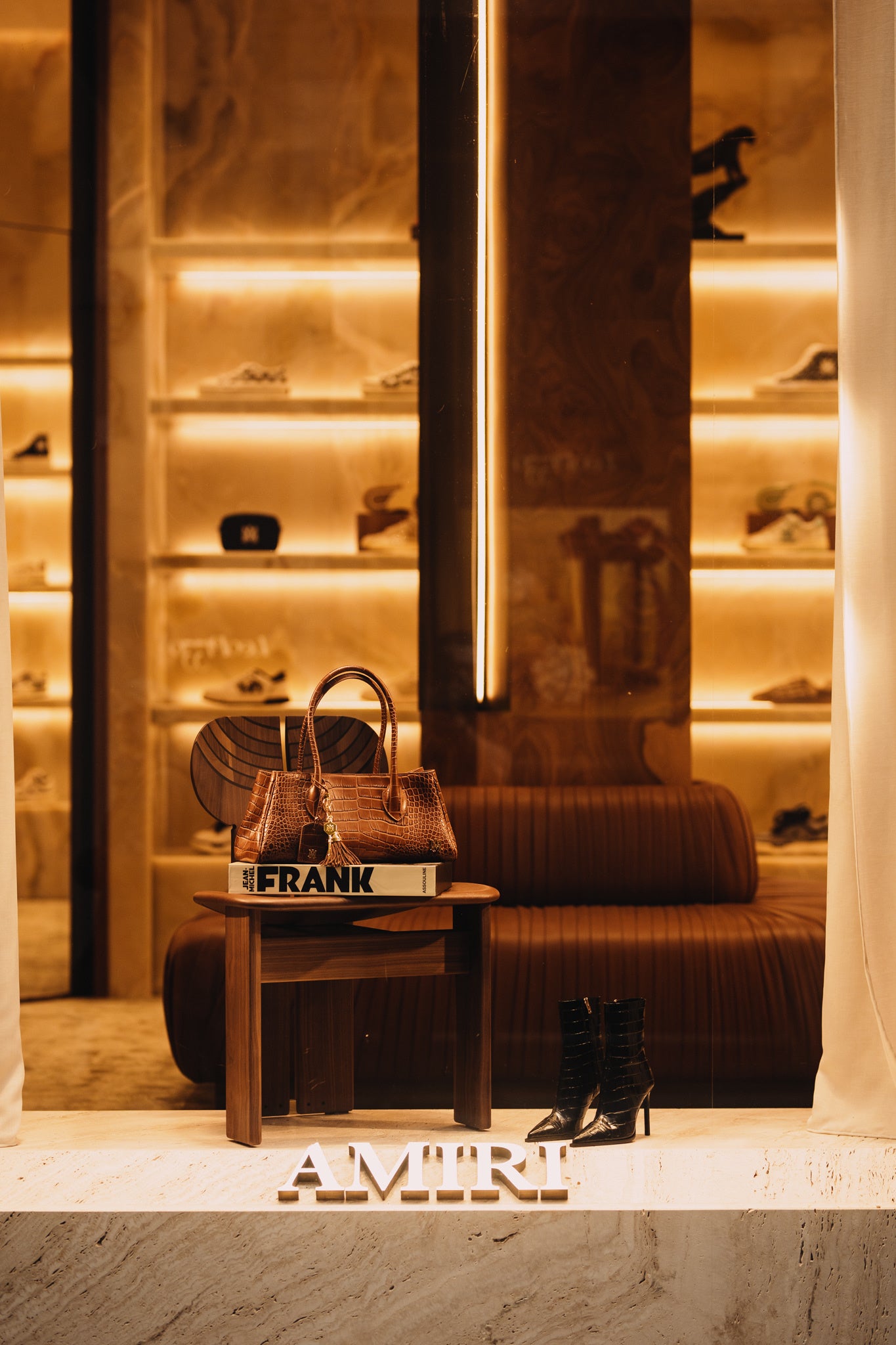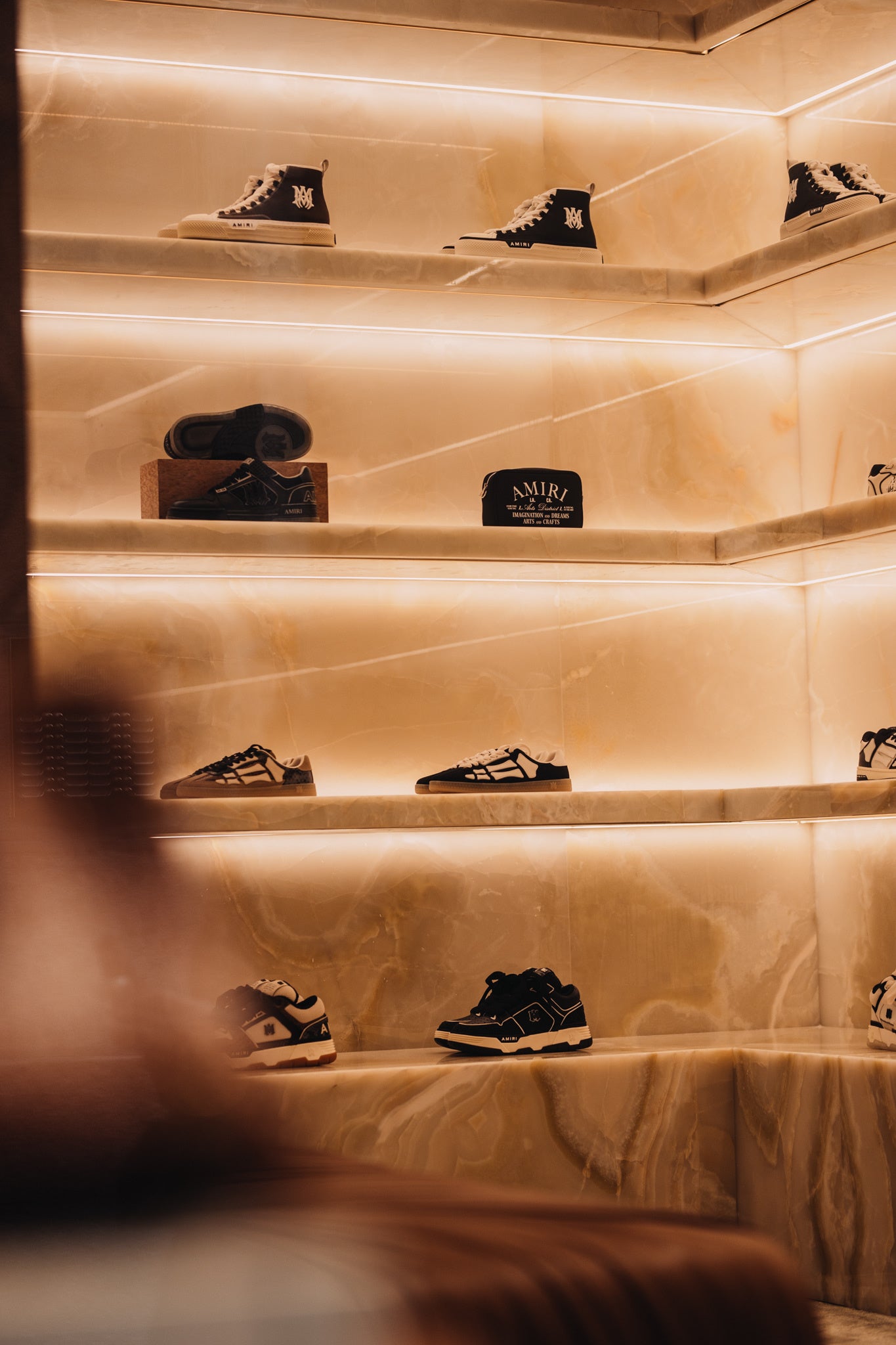 モダンなアイコンであるフットウェアを展示する空間では、淡いグリーントーンのオニキスを使用した壁と棚や、ベルベット張りのベンチシートが印象的な背景を演出します。建物のピアノ・ノービレ(メインフロア)では、ウェストコーストのルーツを感じさせる温かみある壁紙や柔らかなヴィンテージ調テキスタイルと、洗練されたライムストーンやトラバーチンのシェルビングが美しく対比します。一方下層階はアミリラウンジとなり、ゴールドのカリフォルニアカラーで来訪者を包み込みます。面取りしたガラスのバーや、木製ボワズリーに織り込まれたタペストリーアートが、ハリウッドスターの私邸を思わせる控えめなグラマーさを演出します。随所に配置されたヴィンテージ家具や美術品 ― アール・デコのランプやテラッツァソファ(ドイツ人デザイナーがデザインした名作ソファ)、ヴィンテージテーブル ー が現在と過去をつなぎ、過去の響きが未来の断片へと文脈づけます。全体を通して、ロサンゼルスで生まれたラグジュアリーの現代的解釈が息づく空間となっています。