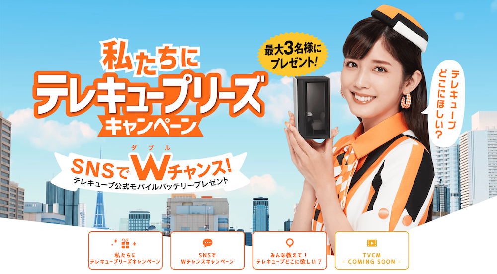 また、「私たちにテレキュープリーズ」キャンペーンのTwitterまたはInstagram公式アカウントをフォローし、リツイートまたはいいね!をしていただいた方の中から、抽選で100名の方に「テレキューブ公式モバイルバッテリー」をプレゼントします。