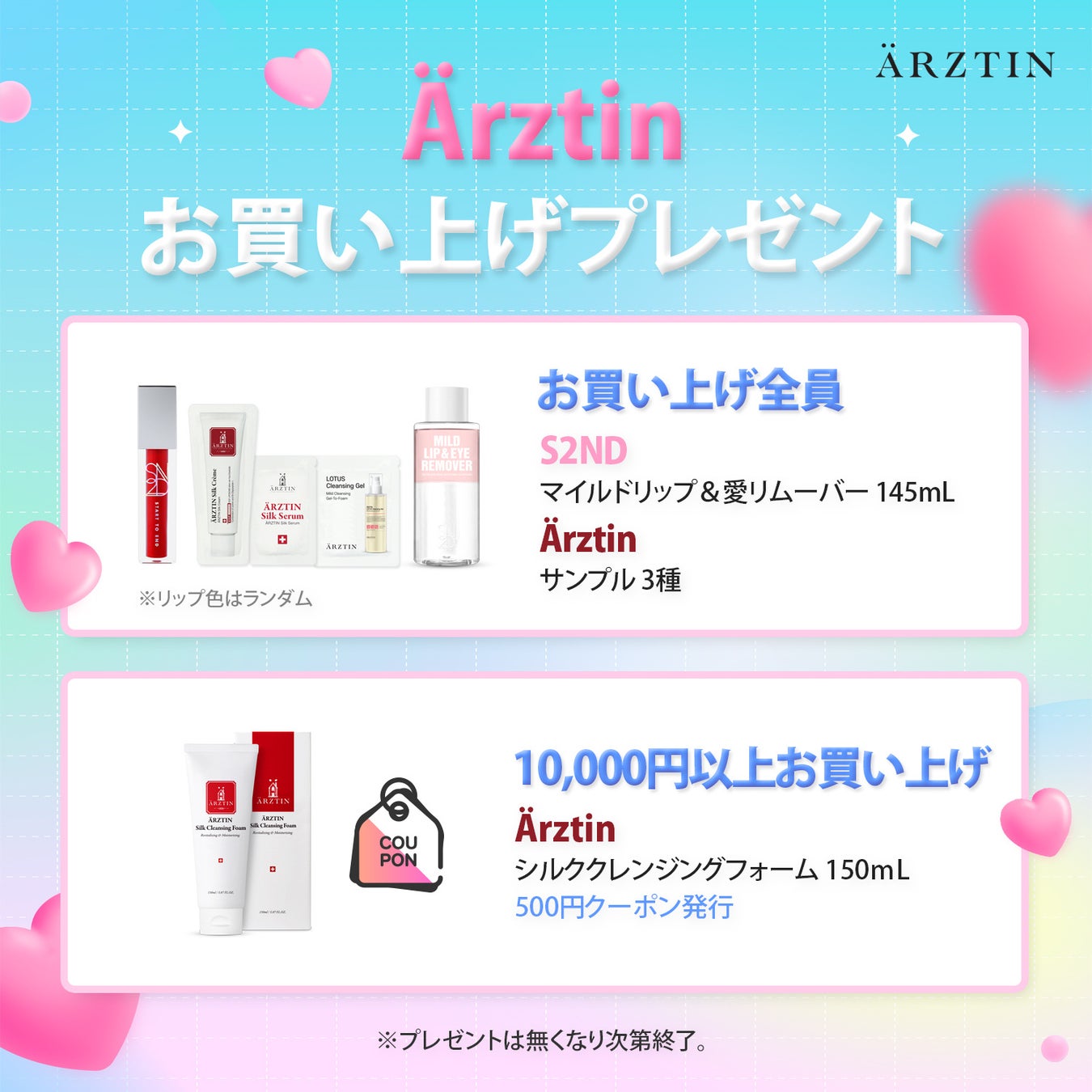 今回のエルツティンQoo10公式ショップのメガ割では、最大20%OFFとお買い上げの方全員には「S2NDマイルドリップ&唇リムーバー現品」とサンプルセットが、1万円以上のお買い上げプレゼントは「ARZTINシルククレンジングフォーム現品」と500円クーポン発行そうして送料が無料のチャンスなどプレゼントがたくさんもらえます。