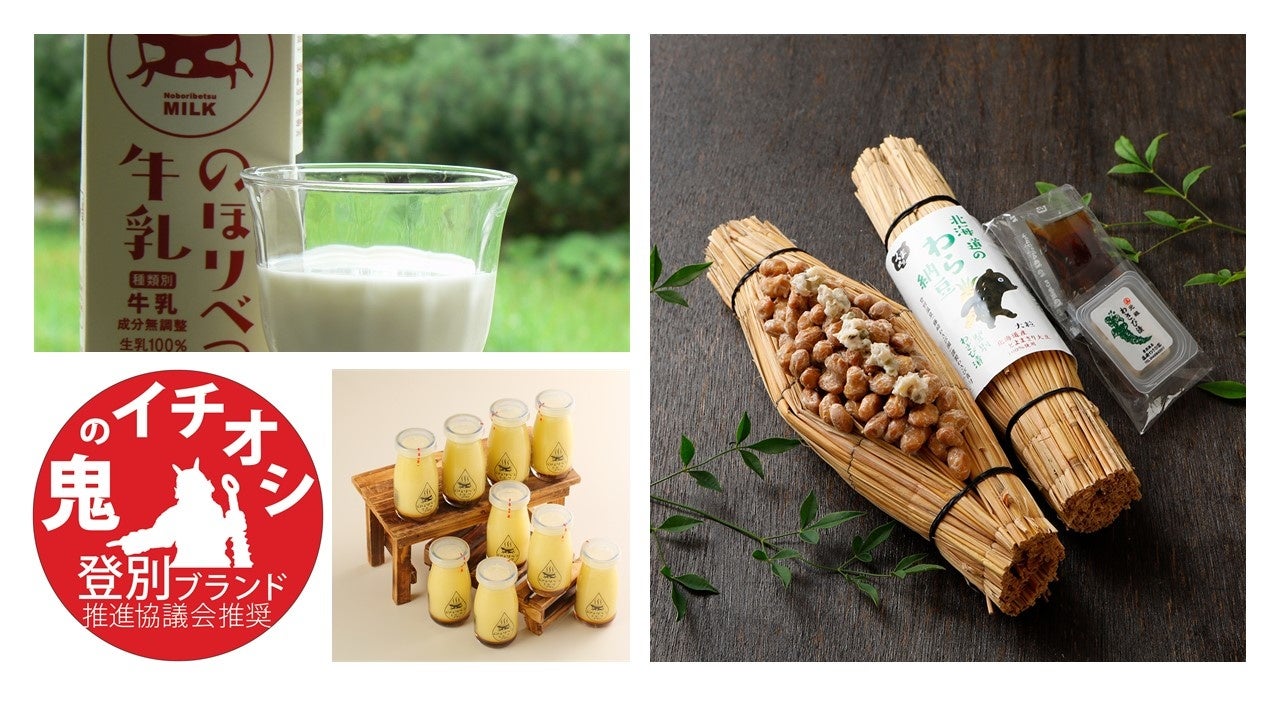 写真左上:のぼりべつ牛乳、左下:のぼりべつとろ~りプリンセット、右:わら納豆とわさび漬け