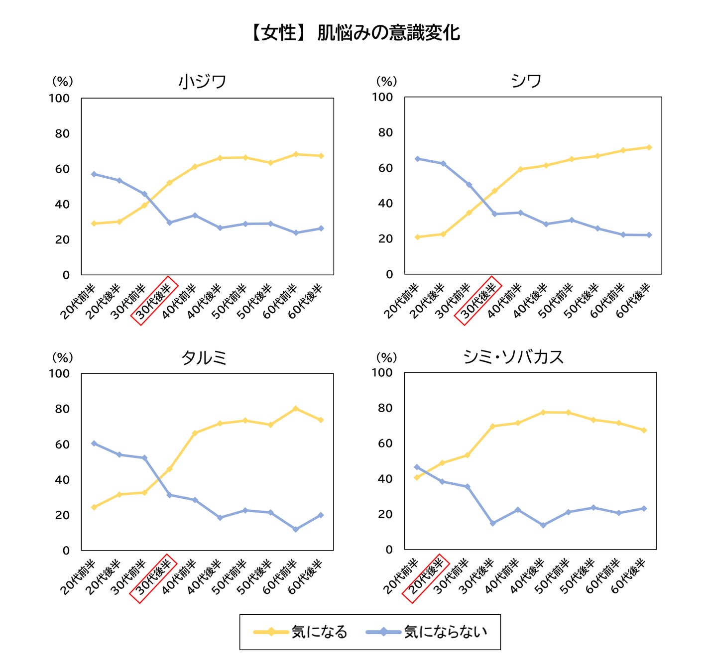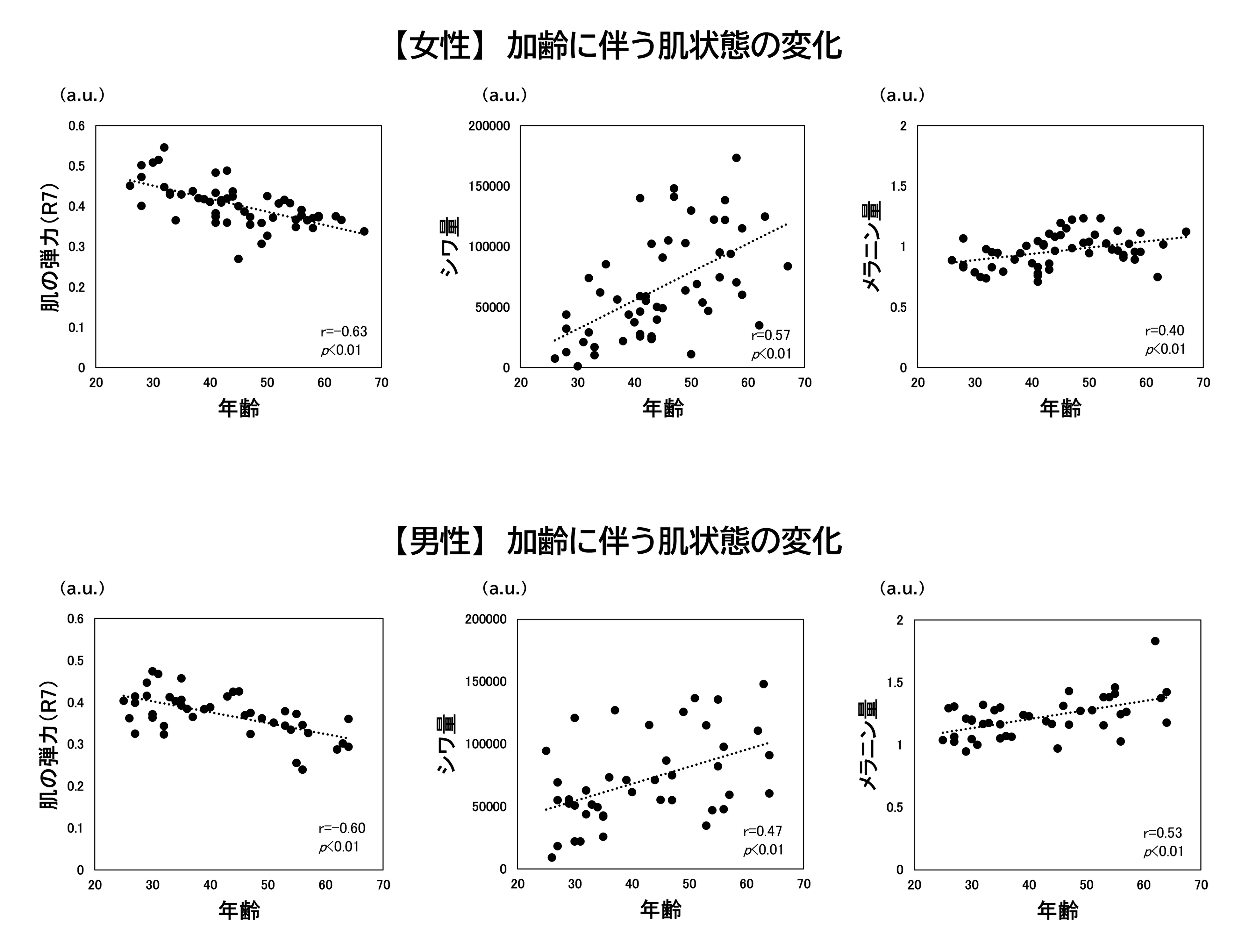 肌の弾力の低下はシワやタルミに、メラニン量の増加はシミの発生に関与するとされており、加齢にともない、男女ともに小ジワ、シワ、タルミ、シミ・ソバカスが現れやすい肌状態へと変化していることが示されました。