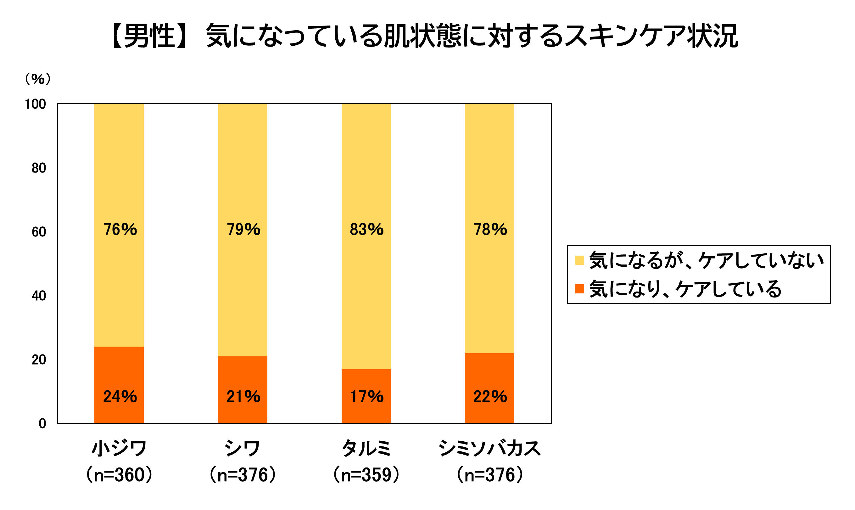 肌状態の変化が気になっている男性に対し、小ジワ、シワ、タルミ、シミ・ソバカスをケアしているか調査した結果、「気になるが、ケアしていない」と答えた人は76~83%と多数を占めました。