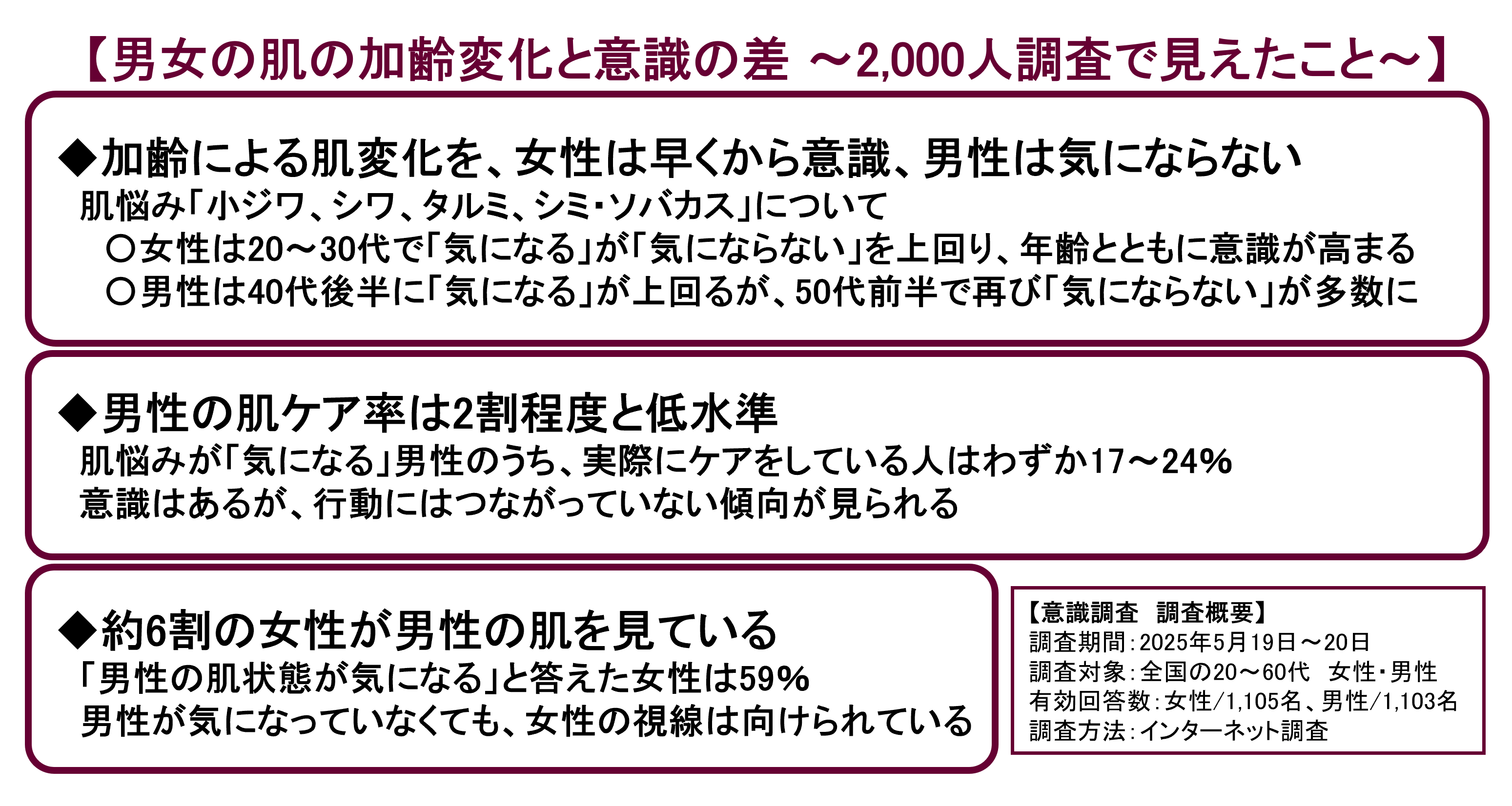 今回の調査により、男性は加齢に伴う肌変化に対して無頓着な人が多いことが明らかになりました。一方で、女性の約6割が「男性の肌状態が気になる」と回答しており、男性自身が気になっていなくても、肌には視線が“向けられている”ことがわかりました。