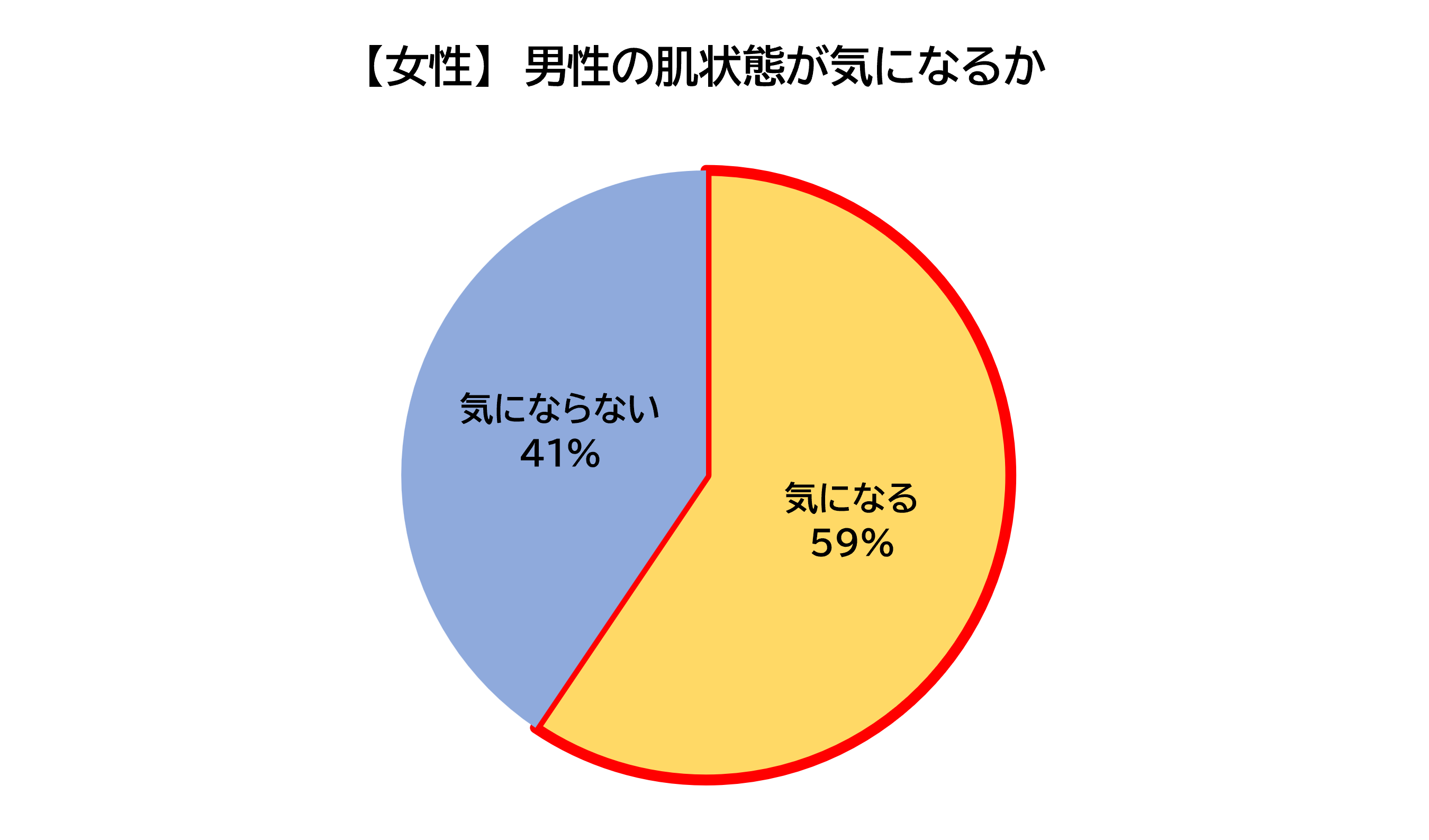 女性に対し、男性の肌状態が気になるかを調査した結果、「気になる」と答えた人は59%にのぼりました。男性自身は肌状態が気になっていなかったり、ケアしていない場合が多いものの、女性からはその肌を見られていることが明らかになりました。