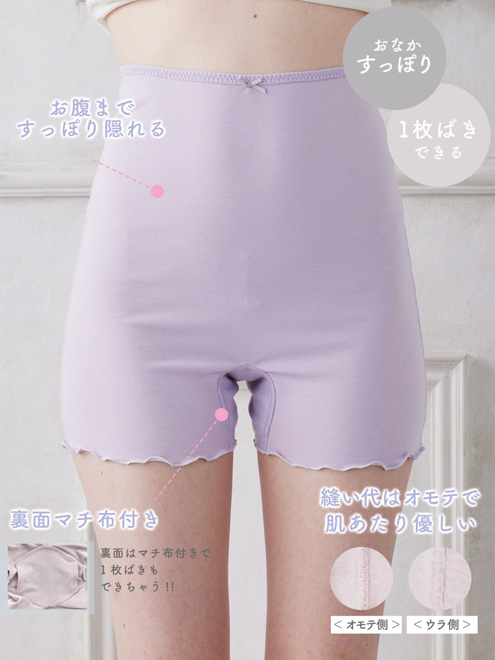 お腹まですっぽり隠れるサイズ感で肌当たりが優しく、裏面はマチ布がついているので、1枚ばきもできる優れものです。