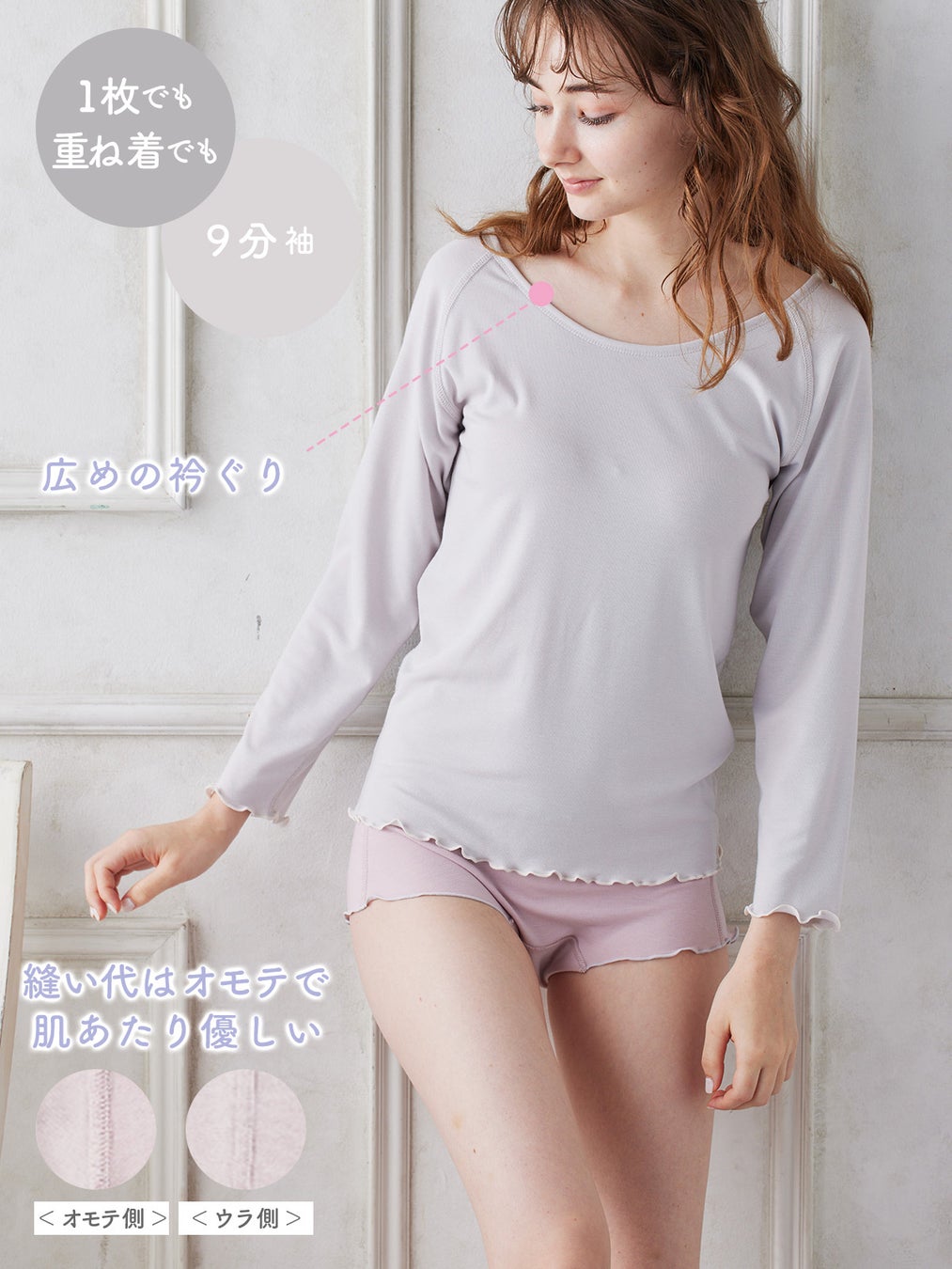 9分袖で襟ぐりが広めの女性らしいシルエットとなっており、1枚で部屋着としても、インナーとしても使えます。縫い代が表にあり肌当たりが優しい仕様となっており、気分の上がる可愛い配色メローです。
