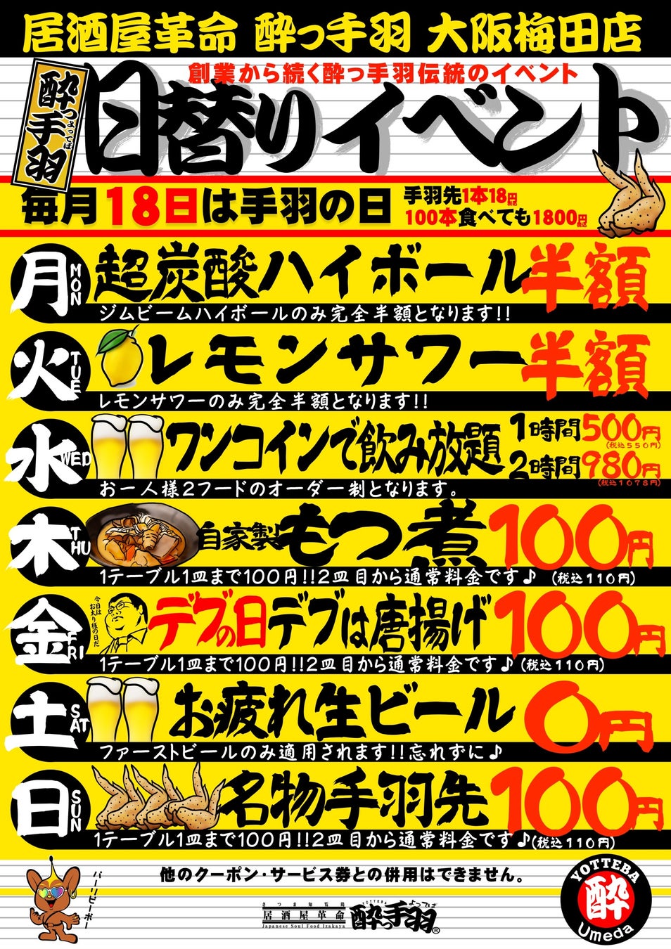 また、毎日「日替りイベント」を開催しており、月曜日は超炭酸ハイボール半額、火曜日はレモンサワー半額、水曜日は飲み放題が1時間500円など、各店舗ごとに日替わりの特売企画を実施しています。さらに、毎月18日は「手羽の日」として「伝説の手羽先(3本319円、5本429円)」を1本18円の特別価格でお楽しみいただいています。