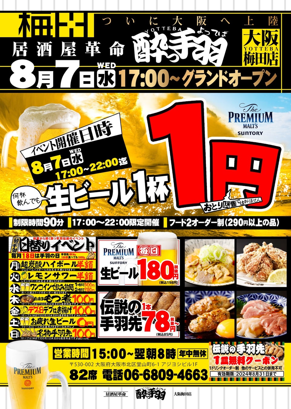 【新規オープン】大阪に初上陸!手羽先自慢の居酒屋『酔っ手羽』2024年8月7日(水)17時『居酒屋革命 酔っ手羽 梅田東通り店』オープン 当日は生ビール1円