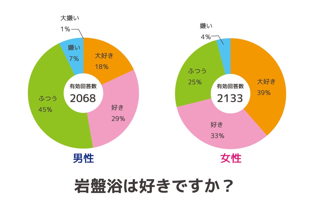 過去のニフティ温泉の調査では、岩盤浴が好きと答えた男性は約半数、女性はなんと7割以上。女性の場合は「大好き」の割合が最も多く、岩盤浴は特に女性からの人気が高いことがわかります。
