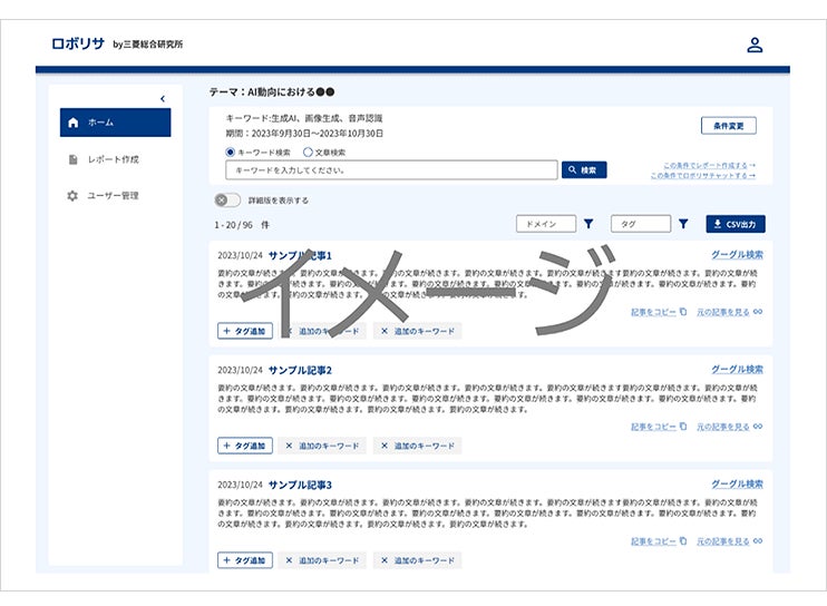 MRIは、経験・技能によるものづくり革新を目指す「匠AI」や審査業務のDXを実現する「審査AI」など、多くのAIを開発し、企業のDXを推進しています。「ロボリサ」は、「Webから自動で公開情報を調査・収集しデータベースに蓄積、その情報を基に生成AIが高品質なレポートを作成」するツールとして、提供開始以降、調査業務の効率化および品質向上に貢献しています。特に、研究開発や海外動向調査、市場分析等に携わるお客さまから高評価をいただいています。