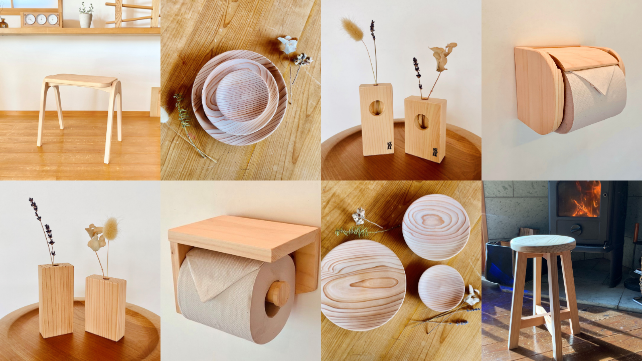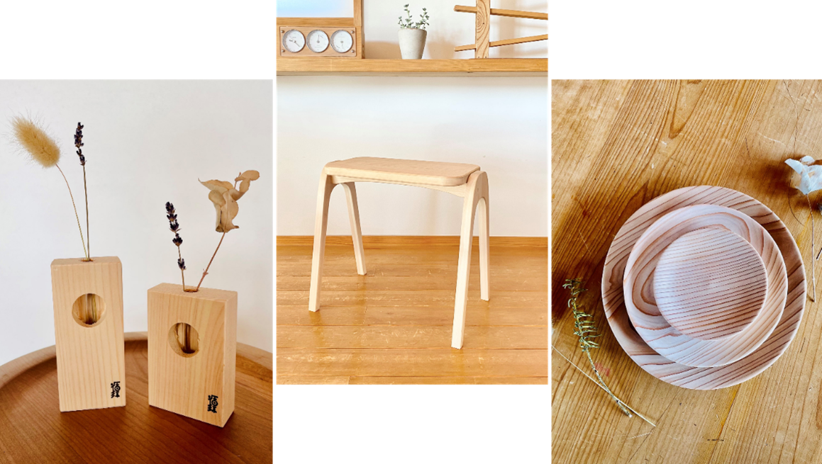 今回、国産の無垢材であるスギやヒノキの建築端材を使った循環皿や一輪挿しなど8種類の商品をご用意しました。原材料である木材を育てた方も、商品の製作者の方も、顔が見える商品です。