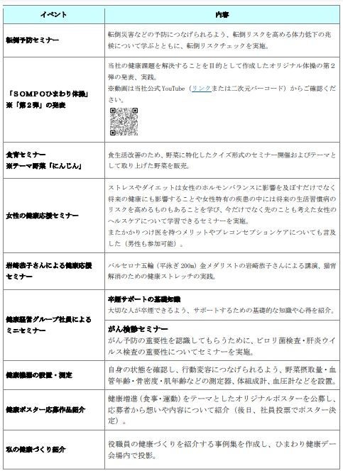 「SOMPOひまわり体操」 | 当社の健康課題を解決することを目的として作成したオリジナル体操の第2弾の発表、実践。 ※動画は当社公式YouTube(リンク:https://www.youtube.com/watch?v=E0QgJufkBZ4)からご確認ください。 |