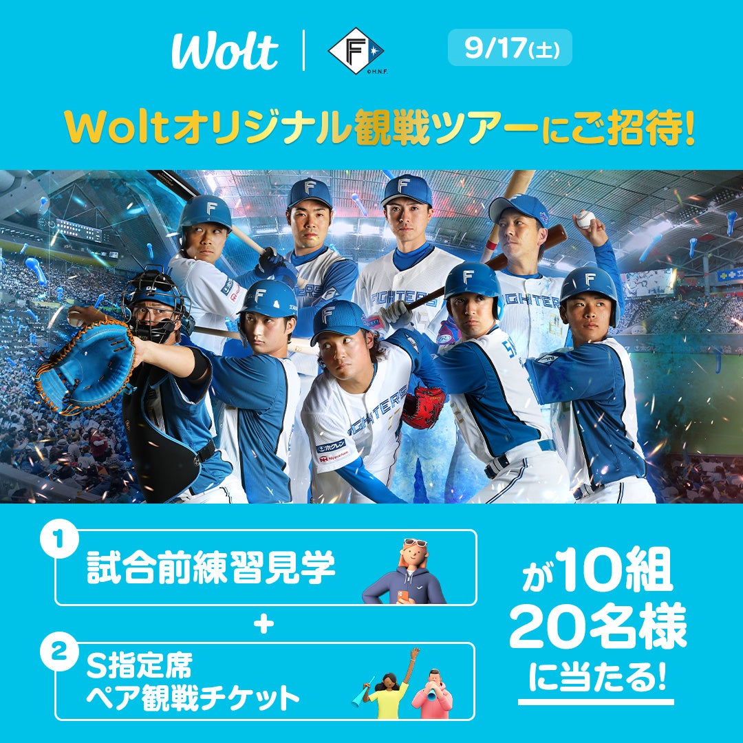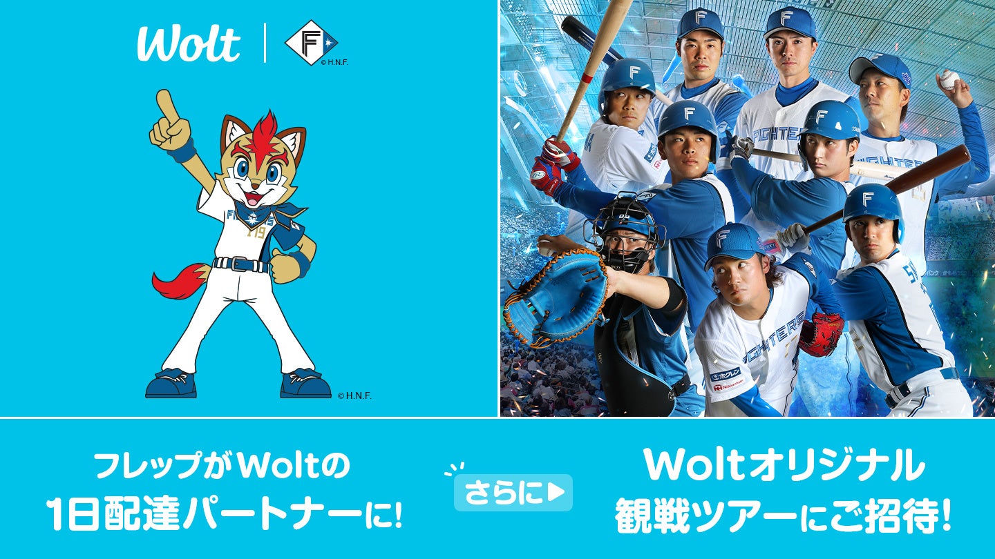 デリバリーサービス「Wolt(ウォルト)」を展開するWolt Japan株式会社は、プロ野球チームの北海道日本ハムファイターズと「スペシャル応援キャンペーン」を実施いたします。ファイターズの公式マスコット「フレップ」が、北海道札幌エリアでWoltの”1日配達パートナー”として抽選で3名様に1万円分のお料理または食料品をお届け(9月10日実施)、10組20名様を「ファイターズの練習見学+北海道日本ハムファイターズ vs. 千葉ロッテマリーンズ戦のS指定席ペア観戦チケット」をセットにした「Woltオリジナル観戦ツアー」(9月17日実施)にご招待します。