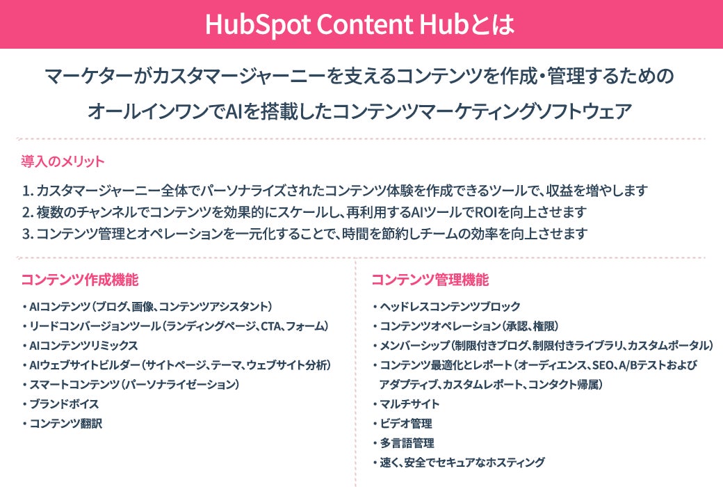 HubSpotには、AIを活用し高品質なウェブサイトやコンテンツを制作・管理することのできる「HubSpot Content Hub」という製品があります。コンテンツマーケティングを強化し、カスタマージャーニーに沿ったコンテンツを効率的にユーザーへ届ける便利な機能を多数搭載しています。